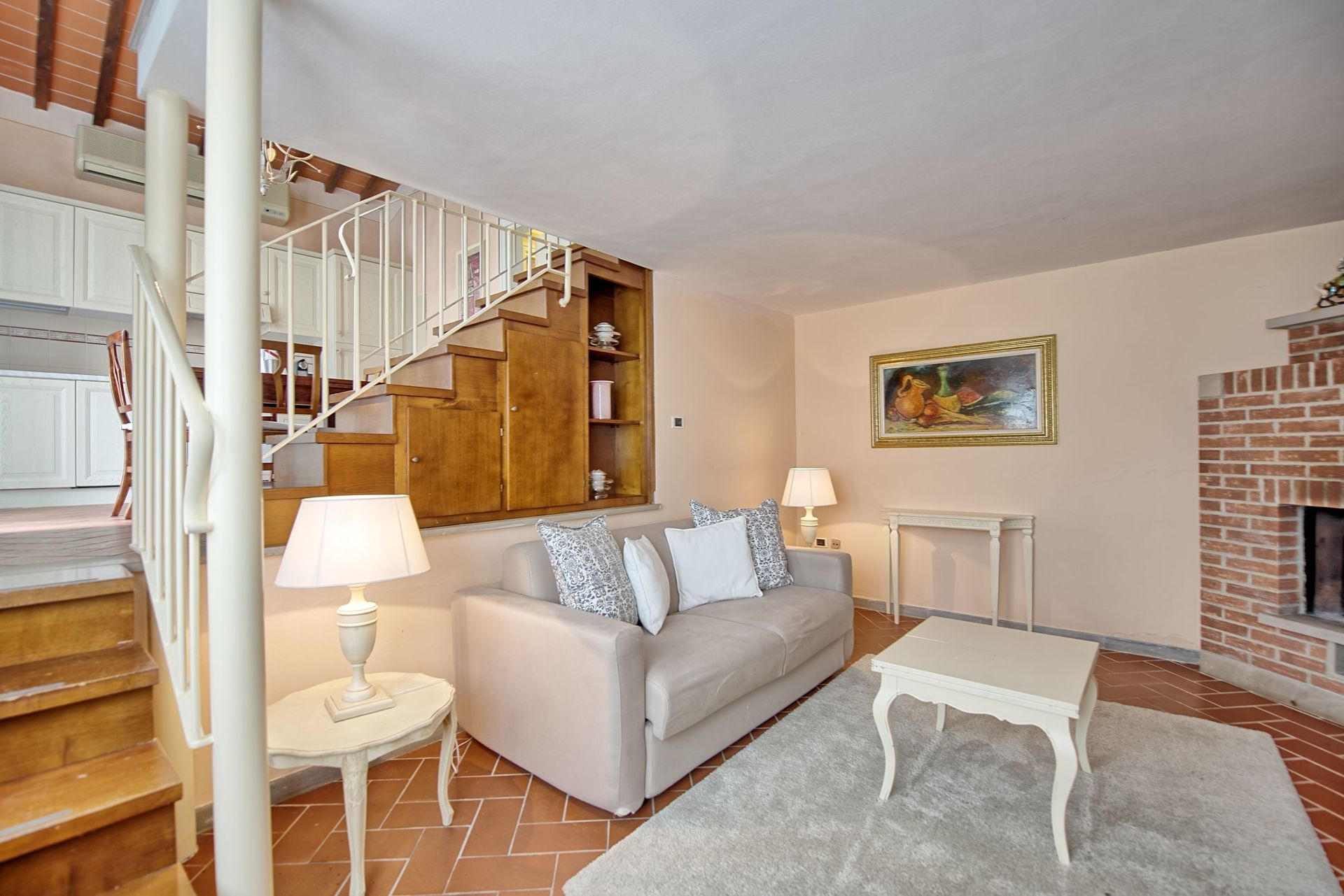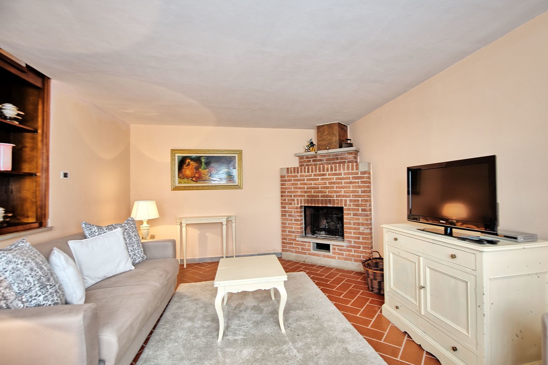 5 gradini sotto: soggiorno con camino e divano letto matrimoniale.
