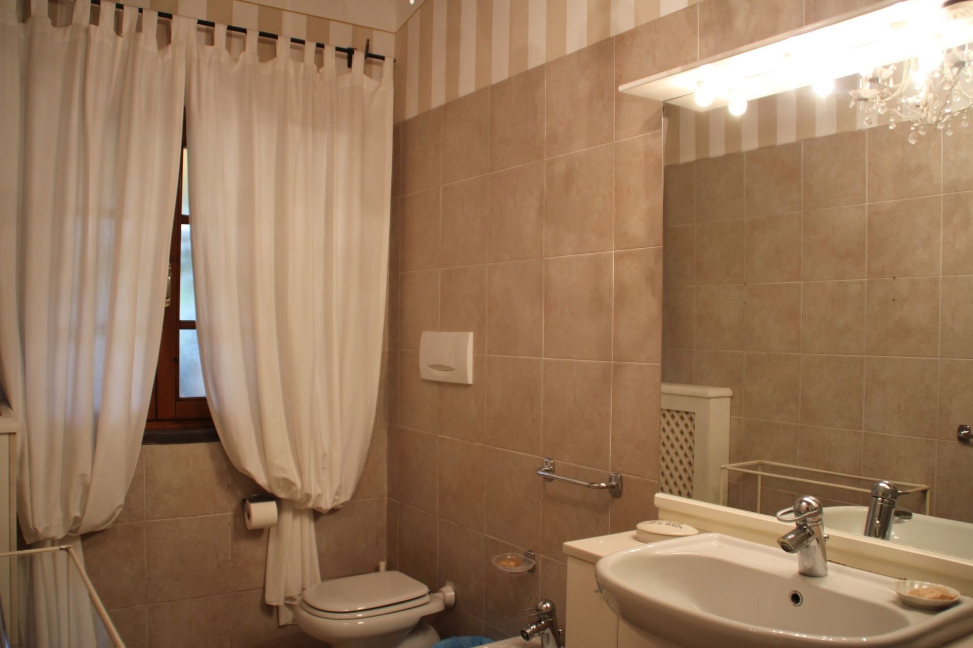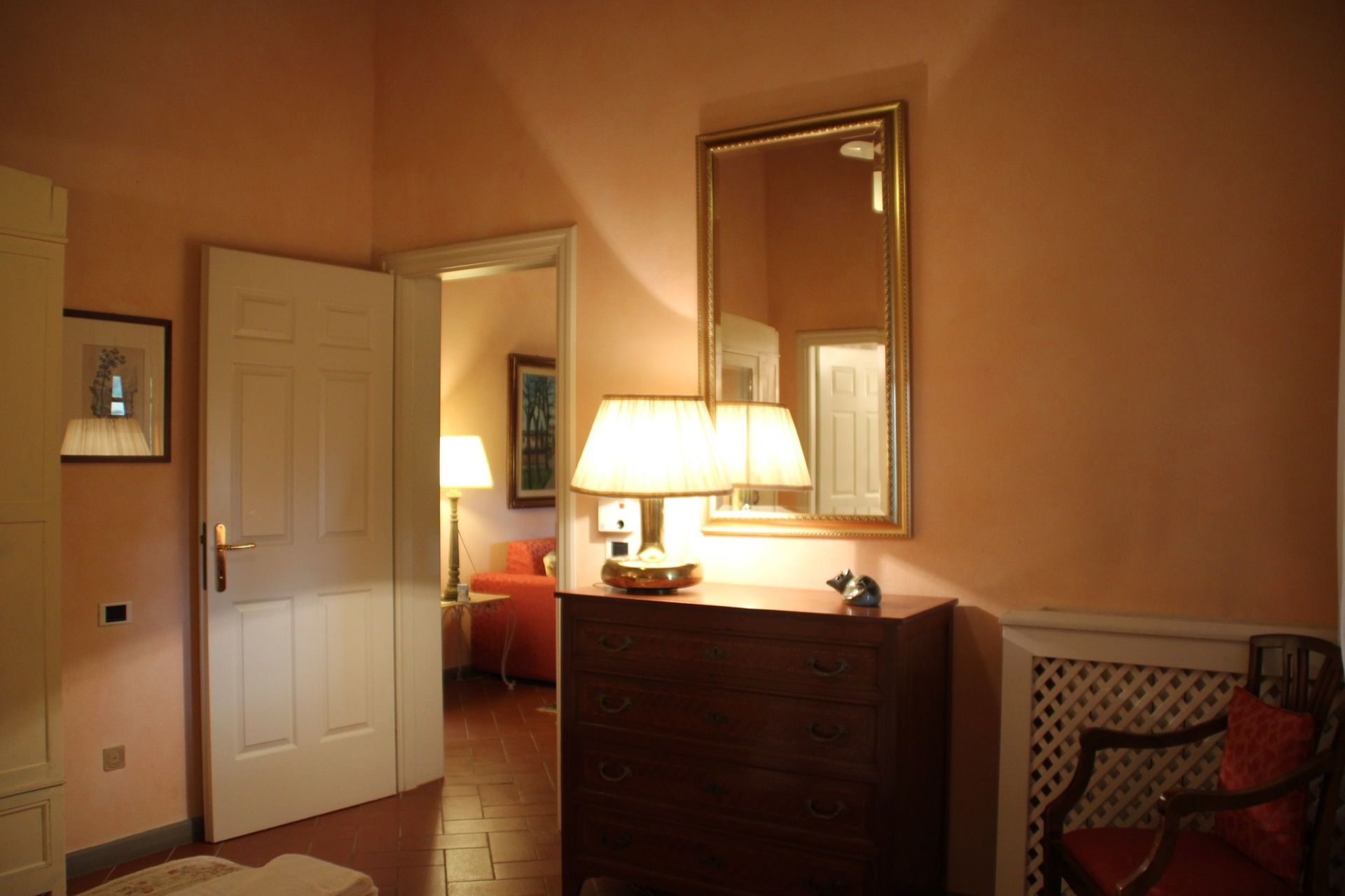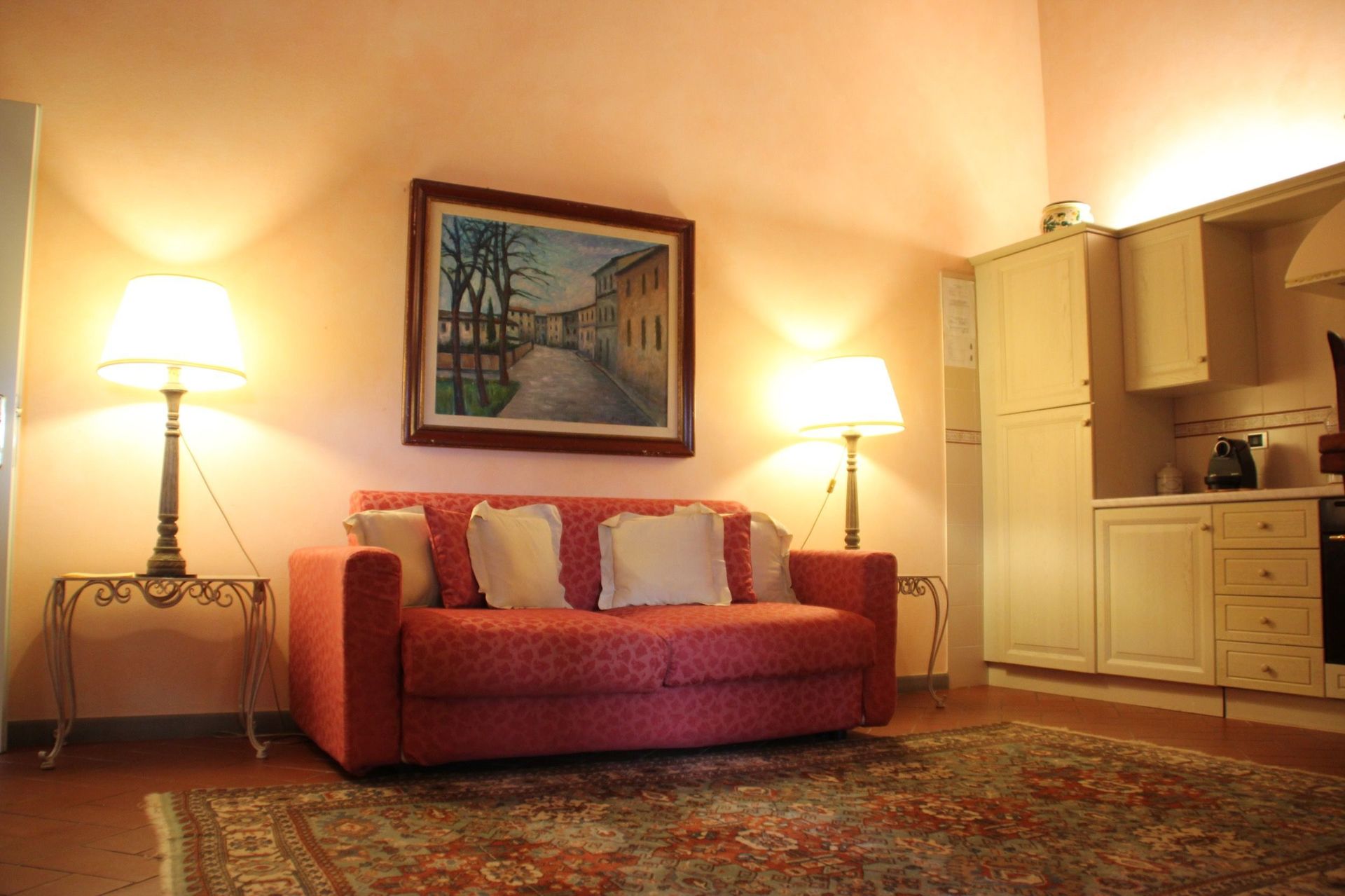 Primo piano: soggiorno (ventilatore a soffitto) con divano letto matrimoniale e zona pranzo con angolo cottura (forno, freezer, lavastoviglie, macchina da caffè espresso), camera matrimoniale (aria condizionata) con bagno privato con doccia.