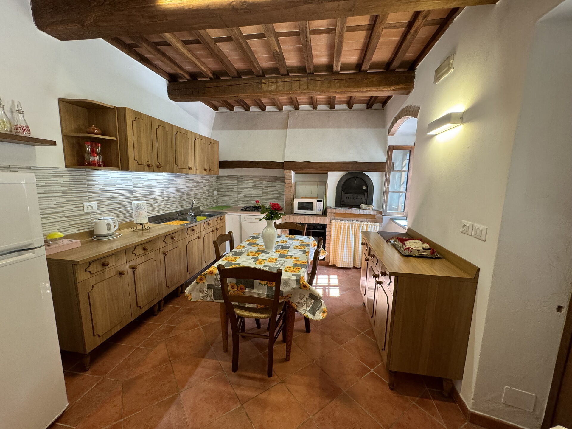 Cucina - soggiorno: tavolo da pranzo, tavolo da pranzo, lavastoviglie, frigo, freezer, microonde, piano cottura, macchina da caffè (italiana), macchina da caffè americano, divano, caminetto, tv satellitare.