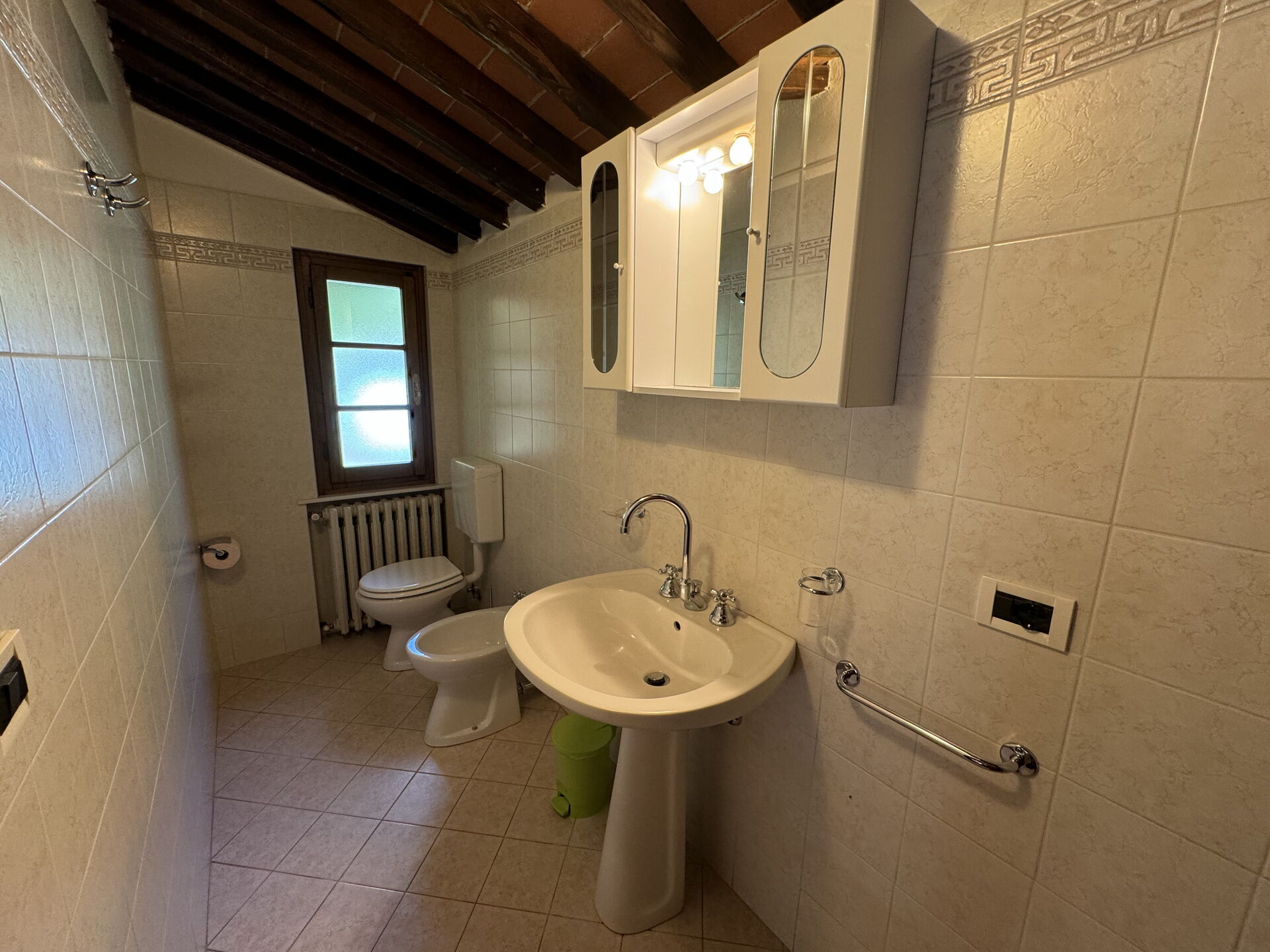 Bagno: lavandino, wc, bidet, doccia.