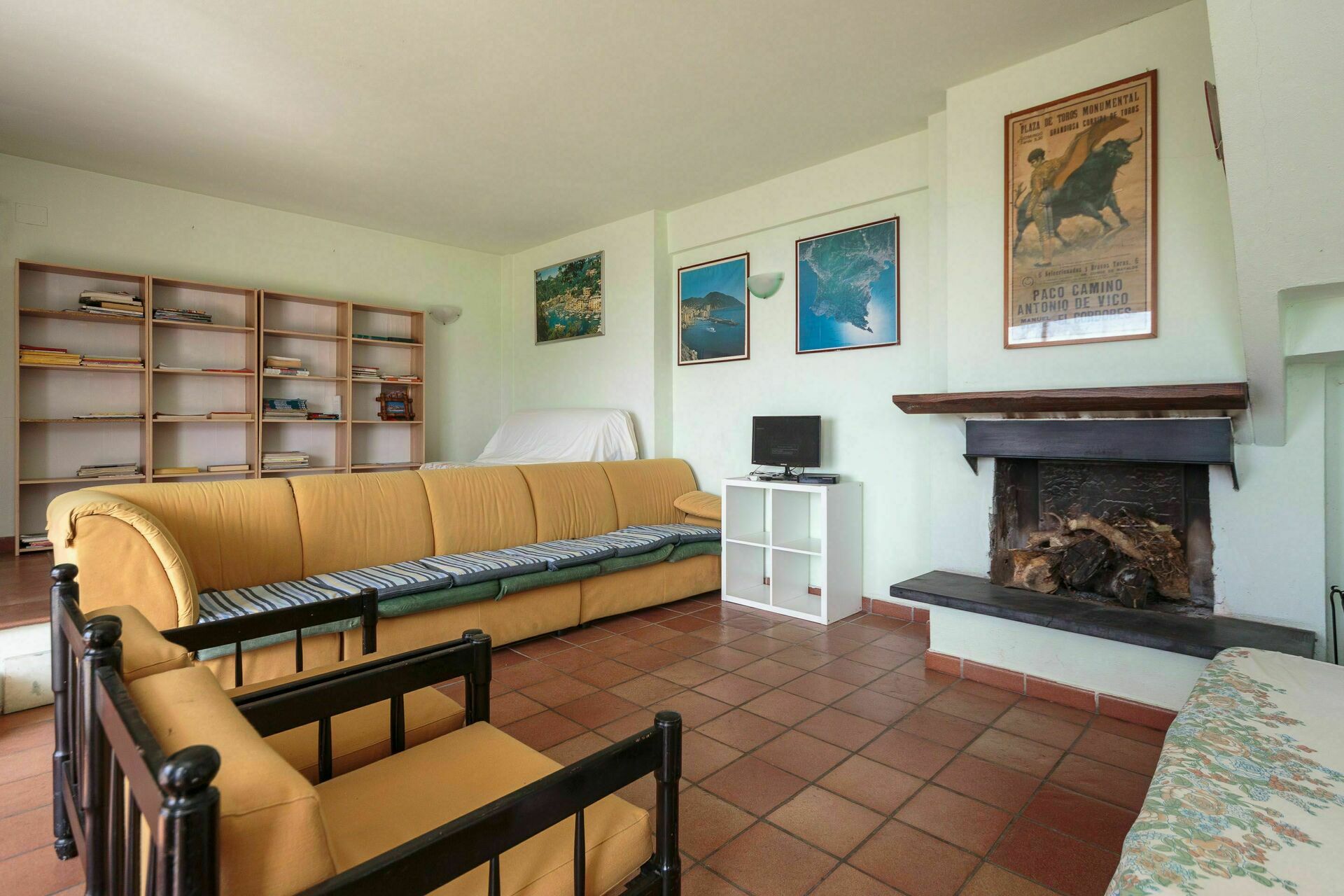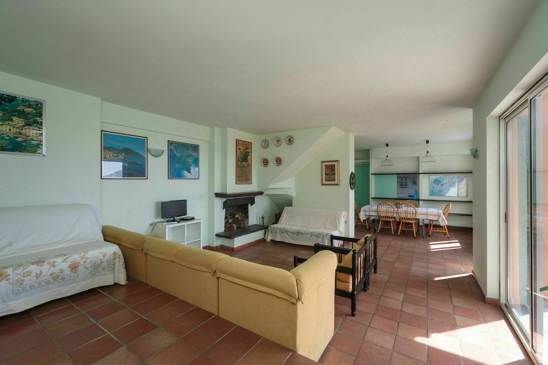 Soggiorno (50 m2): divano, caminetto, divano letto matrimoniale, tv satellitare, uscita sulla terrazza.