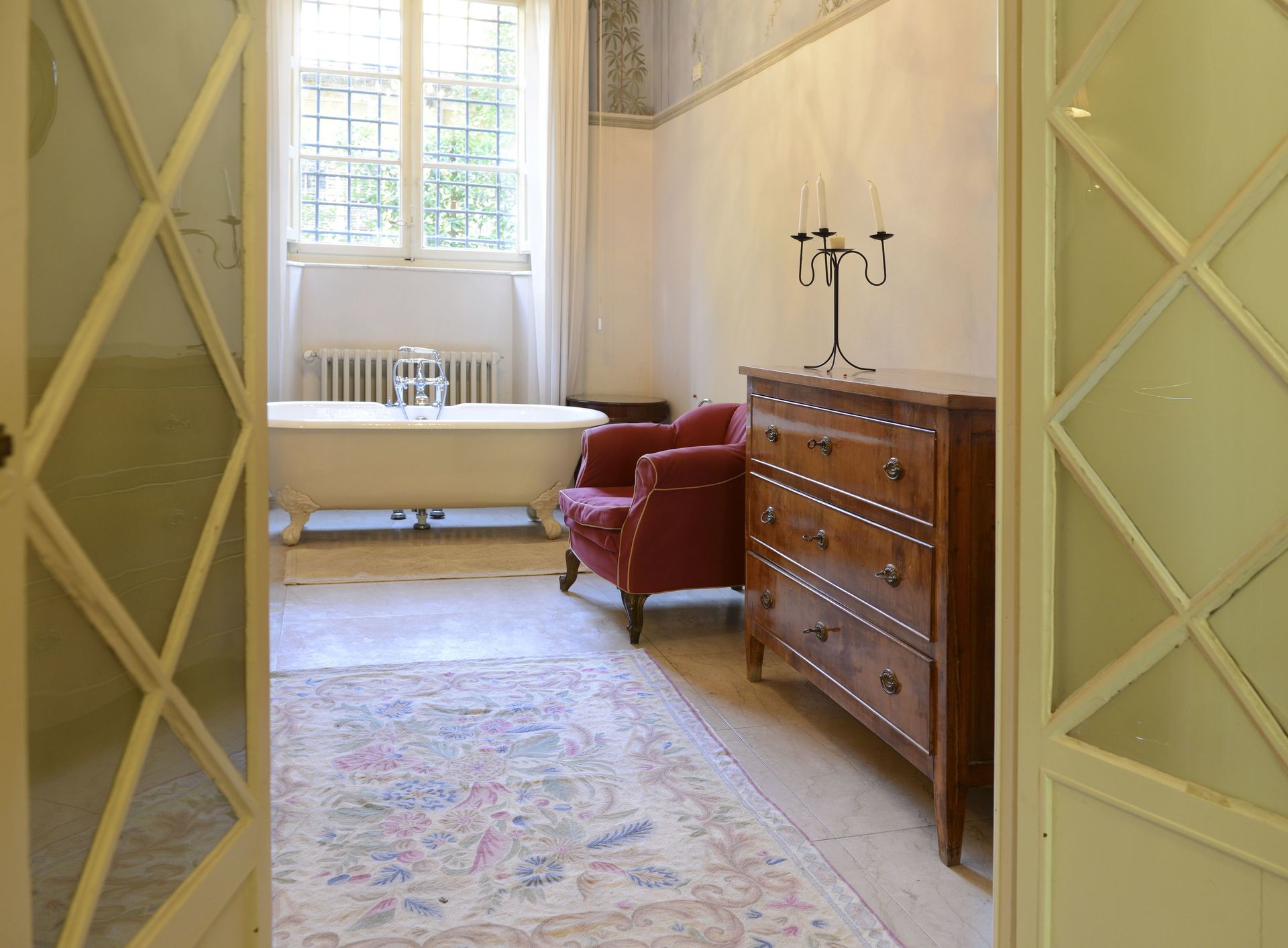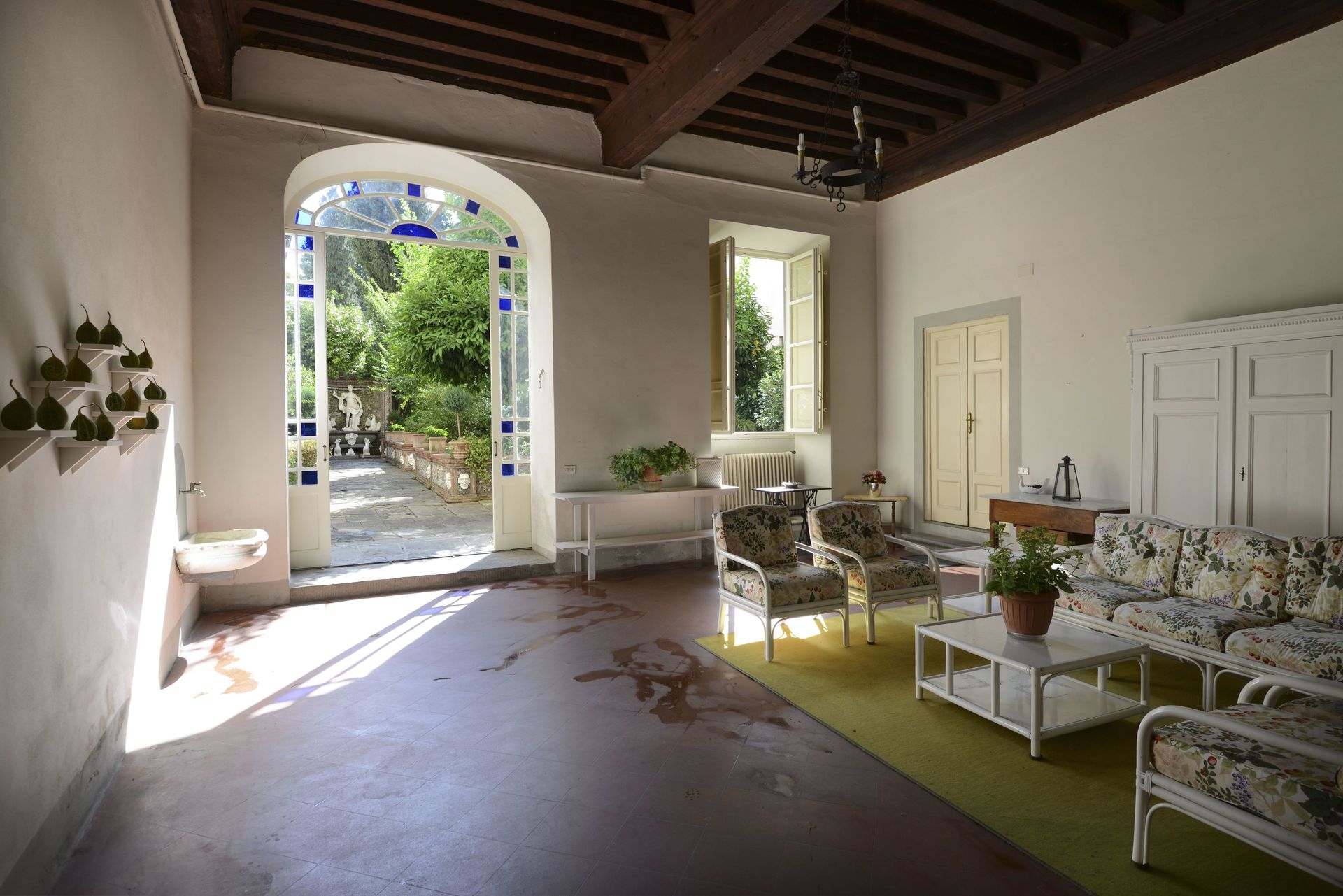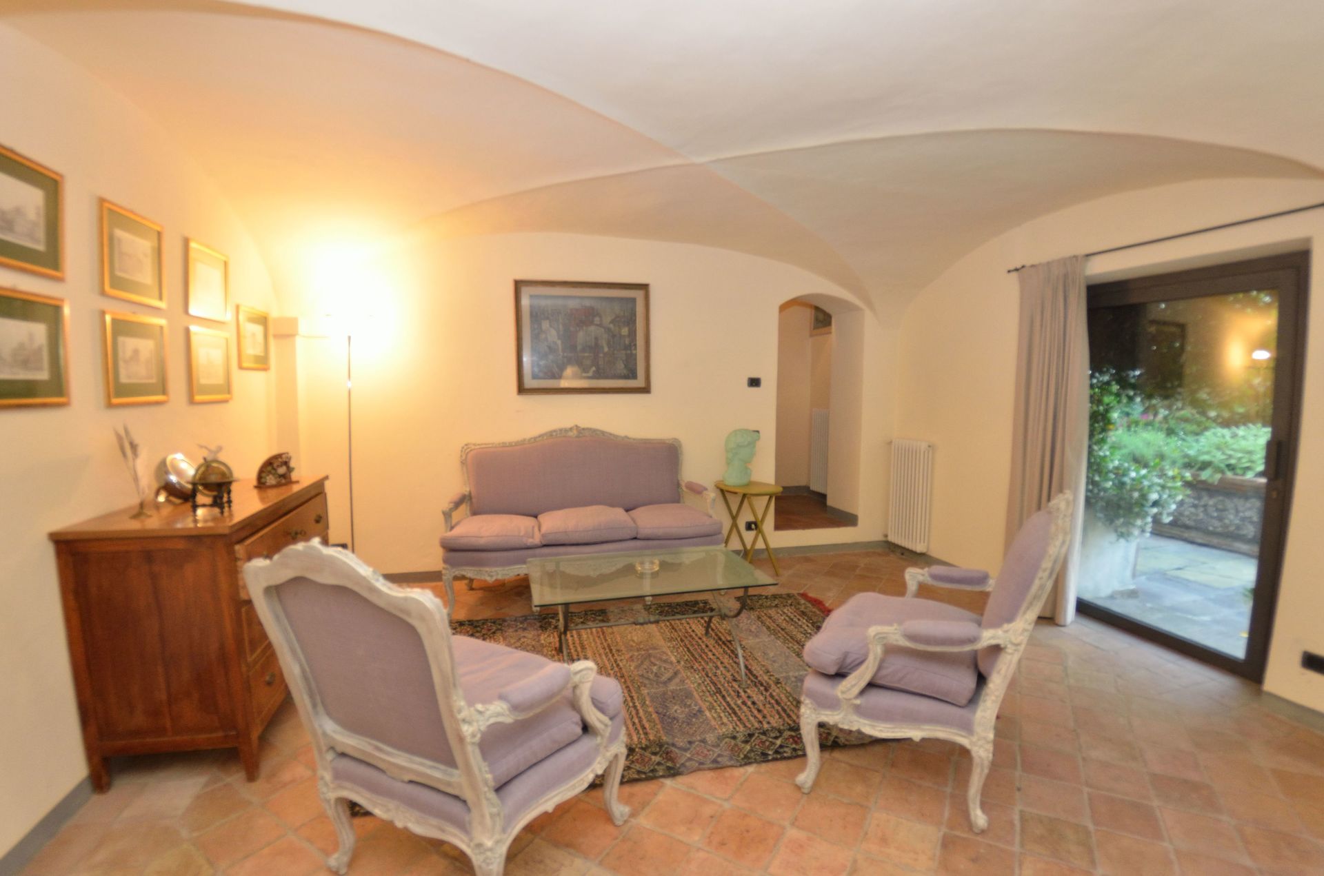 Soggiorno 1: divano, poltrona, uscita sul giardino.