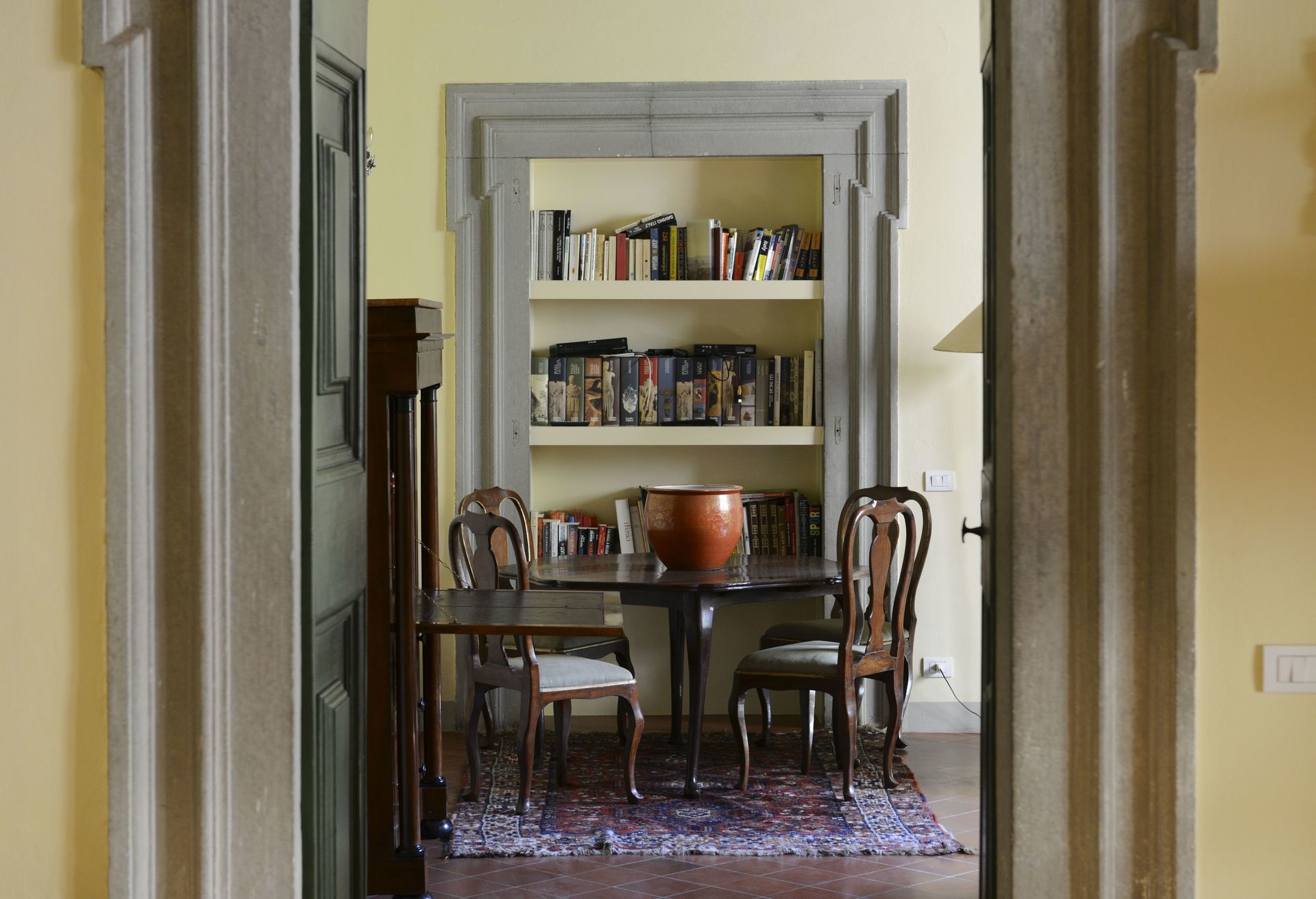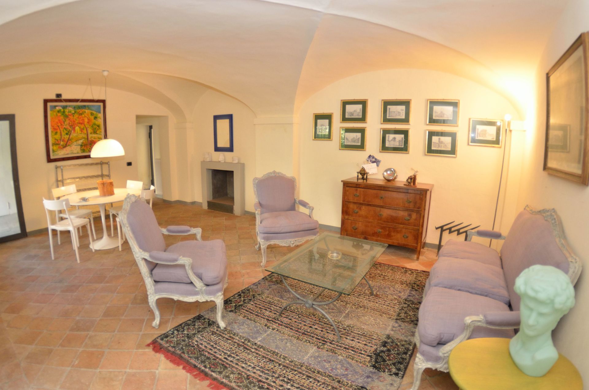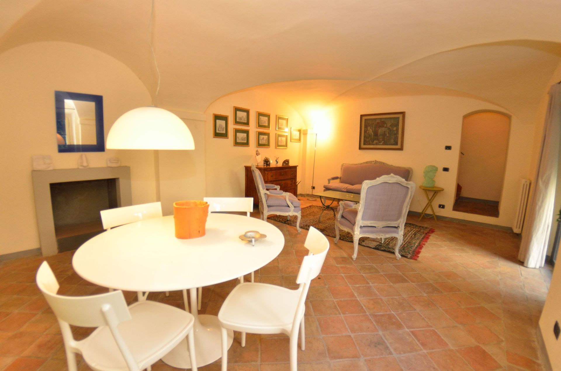 Sala da pranzo: tavolo da pranzo, poltrona, caminetto, uscita sul giardino.
