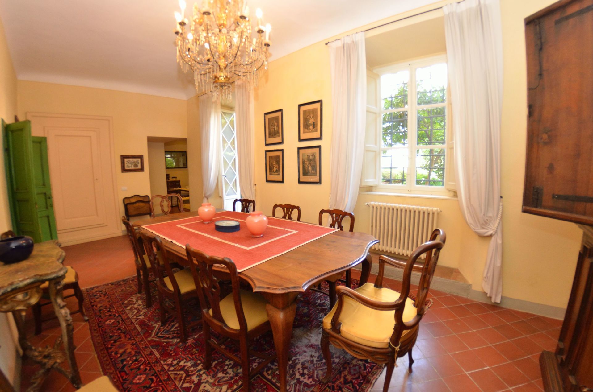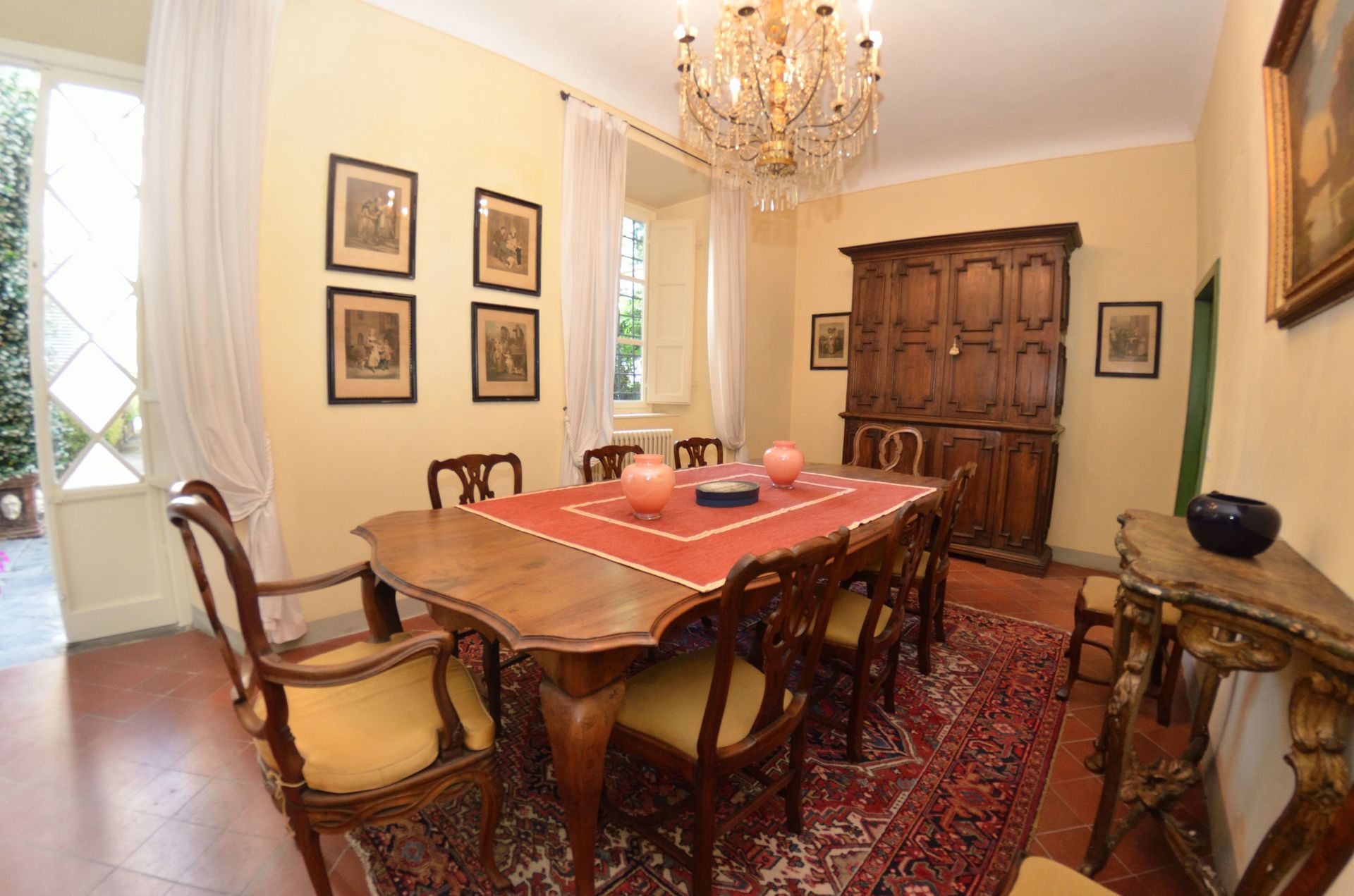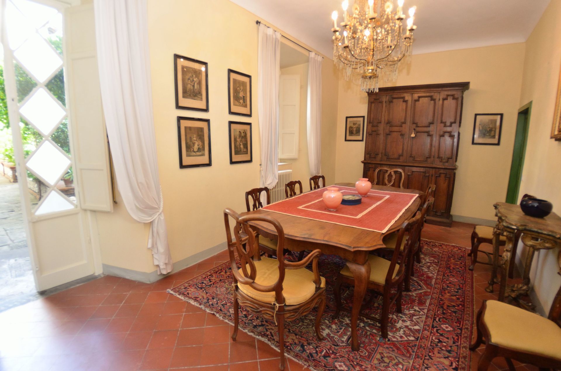 Sala da pranzo: tavolo da pranzo, uscita sul giardino.