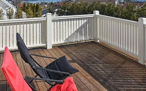 Flott sydvendt feriehus med stor lukket terrasse, og panoramautsikt mot Kornstadfjorden og fjellene.