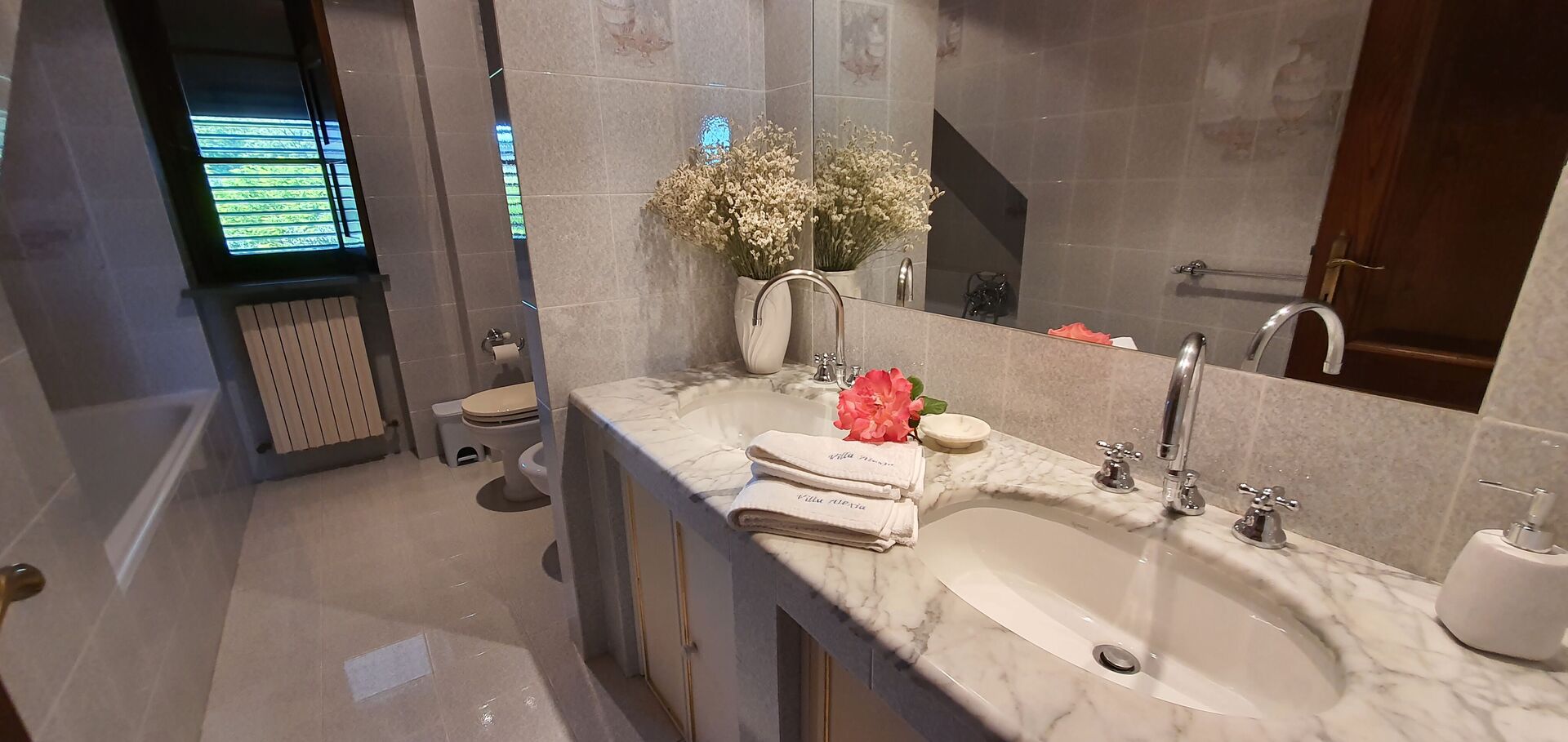 Bagno 1: due lavandini, wc, bidet, vasca da bagno.