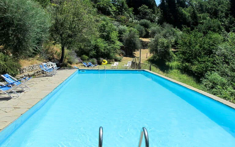 Gli spazi esterni di Villa San Leolino si estendono su 70.000 metri quadri di terreno naturale con alberi e prati aperti. La piscina in comune misura 15 x 7 metri ed è disponibile dal 10 maggio al 25 settembre; una doccia esterna e una terrazza spaziosa completano l'area. La terrazza è arredata con mobili da giardino e rappresenta lo spazio ideale per cene all'aperto e momenti di relax durante le lunghe serate estive. Un barbecue è a disposizione per cucinare all'aperto. L'area esterna comprende anche uno scivolo e un'altalena per i bambini. Sentieri pedonali iniziano a 100 metri dalla casa e conducono direttamente ai margini della foresta circostante, aprendo il paesaggio toscano più ampio all'esplorazione a piedi.