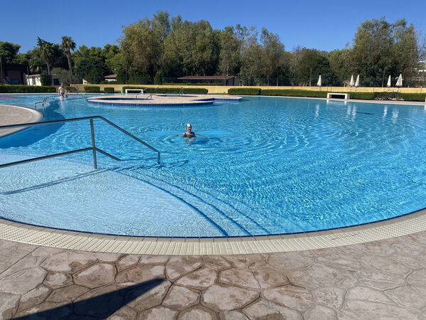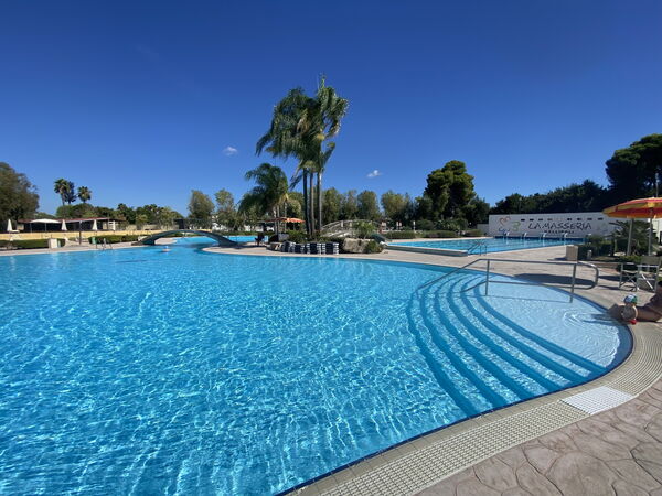 Le aree esterne di Camping La Masseria comprendono 2 piscine condivise aperte dal 1° maggio al 30 settembre, dotate di docce e servizi igienici ubicati direttamente in zona piscina. L'uso di cuffie da bagno è obbligatorio. I terreni offrono un'area giochi dedicata ai bambini, una terrazza per il relax all'aperto e varie strutture ricreative condivise quali ping pong, boccia e beach volley. Un campo da tennis è accessibile a pagamento.