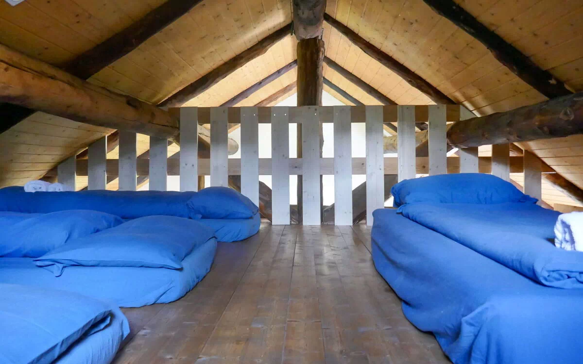 Al secondo piano, accessibile tramite una scala ripida, un'alcova aperta fornisce spazio notte con 4 letti di 80 cm di larghezza e 200 cm di lunghezza, ideale per ospiti aggiuntivi. Questo livello superiore è arredato con mobili da terrazza e offre una vista panoramica sui monti, la valle e la campagna circostante.