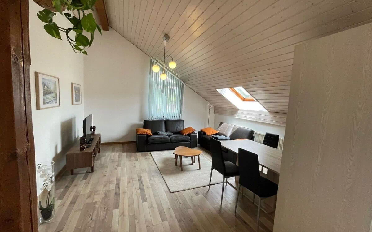 Benvenuti ad Achoumé, un affascinante appartamento mansardato di 3,5 locali di 75 mq che funge da casa vacanze ideale a Porrentruy, Svizzera. L'appartamento dispone di un soggiorno dal carattere distintivo, con rivestimenti in legno e vista sulle montagne da alcune finestre, oltre a un ingresso. La cucina completamente attrezzata si apre sul soggiorno e comprende un tavolo da pranzo, bollitore, macchina da caffè gratuita e capsule, forno a microonde, forno, quattro piastre elettriche, pentole e padelle, nonché utensili da cucina e stoviglie per quattro persone disponibili negli armadi. Nel soggiorno troverete due divani in pelle posizionati davanti a un televisore che offre vari canali, e Internet WiFi è disponibile anche in tutta la proprietà. L'appartamento offre due camere da letto matrimoniali, una arredata con due materassi 90x200 e la seconda con un materasso 140x200 per garantire un riposo confortevole. Due bagni servono l'appartamento, uno dotato di vasca, lavandino, WC e asciugacapelli, mentre il secondo contiene solo WC e lavandino. Sono forniti biancheria da letto in seta e cotone, asciugamani da bagno e da cucina, asse e ferro da stiro, nonché un aspirapolvere. L'edificio dispone di accesso condiviso a un ascensore, lavanderia e lavatrice. Un posto auto privato per la vostra auto è incluso nella proprietà, insieme all'accesso a un giardino condiviso.
