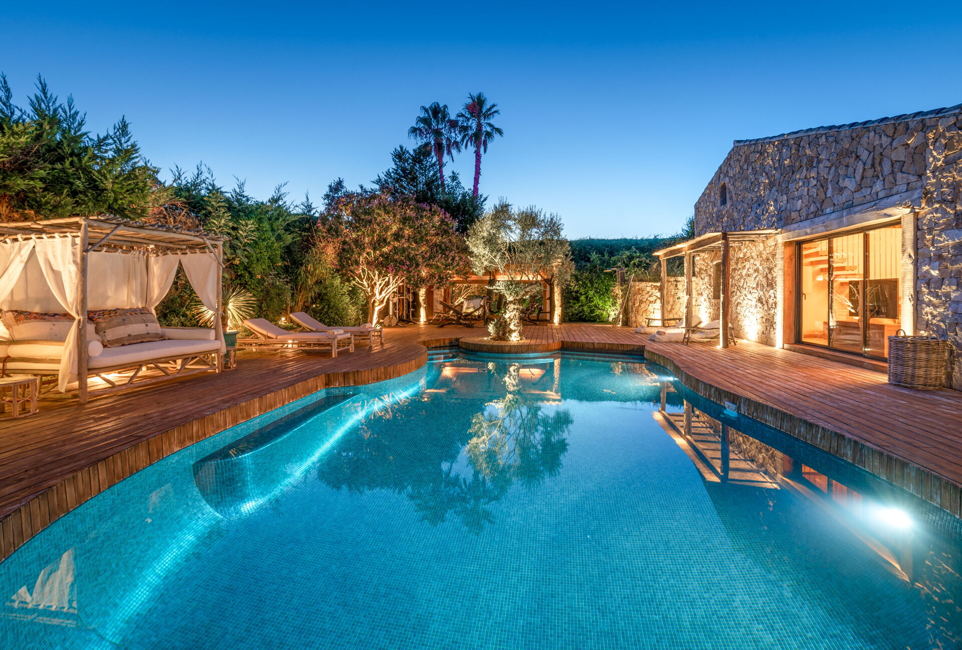 Perla preziosa di questa villa in affitto è senza dubbio la piscina curvilinea (54mq) dalle acque color cobalto che richiamano il colore vivo e intenso del mare. A circondare la piscina ci sono 2 zone di totale relax; la prima è un piccolo gazebo con solarium, la seconda è una zona relax con comodi divani e tavolini.