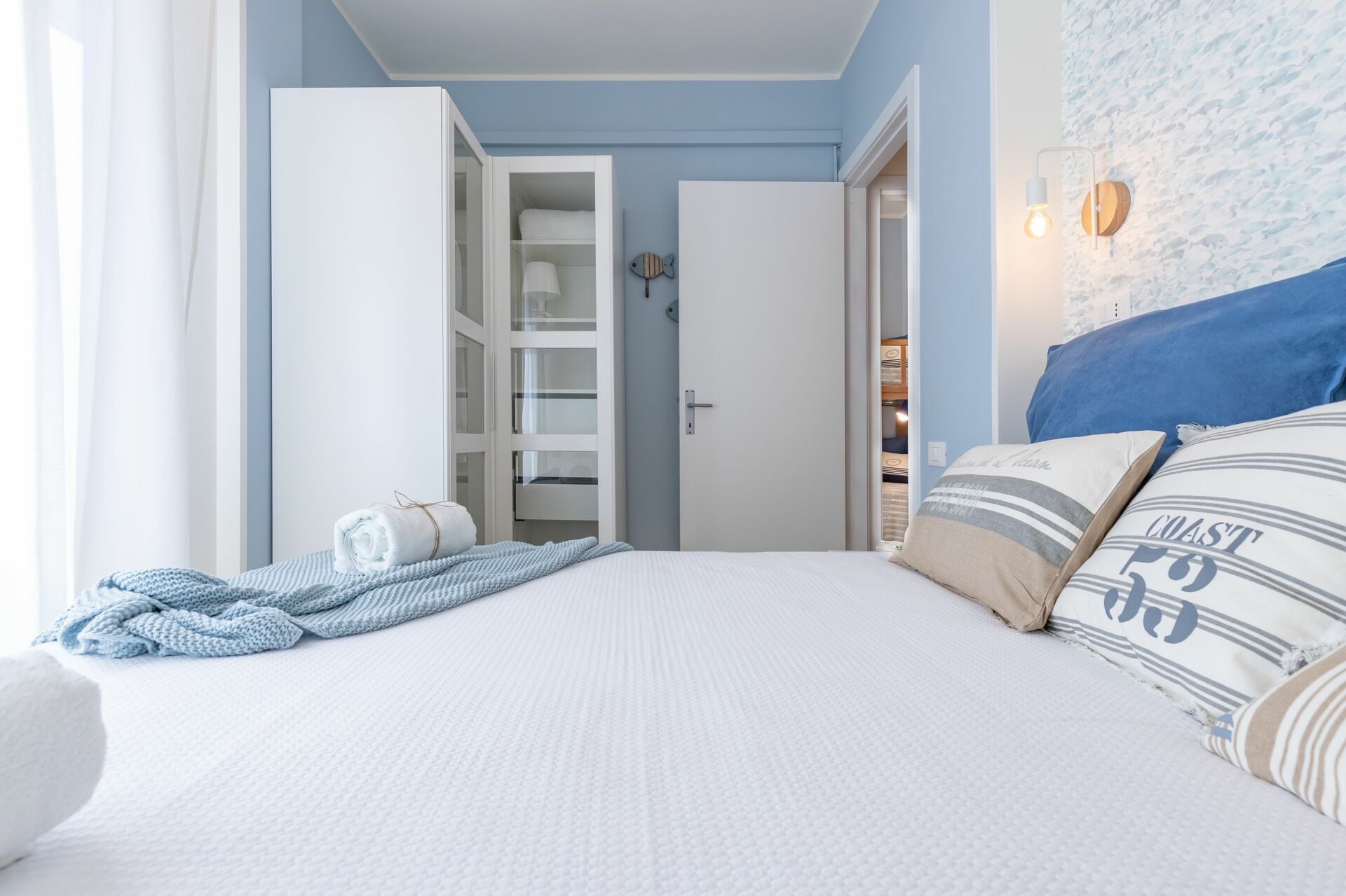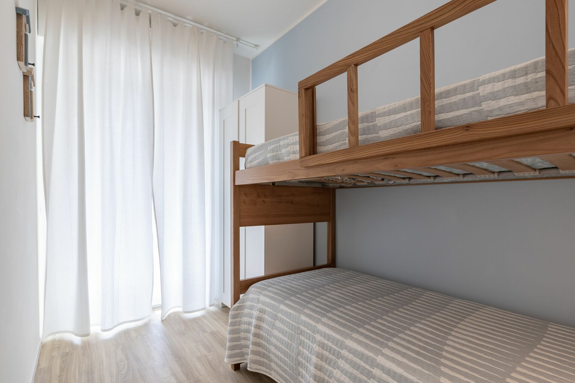 Camera da letto 1 (12 m2): letto a castello, poltrona, uscita sul balcone.