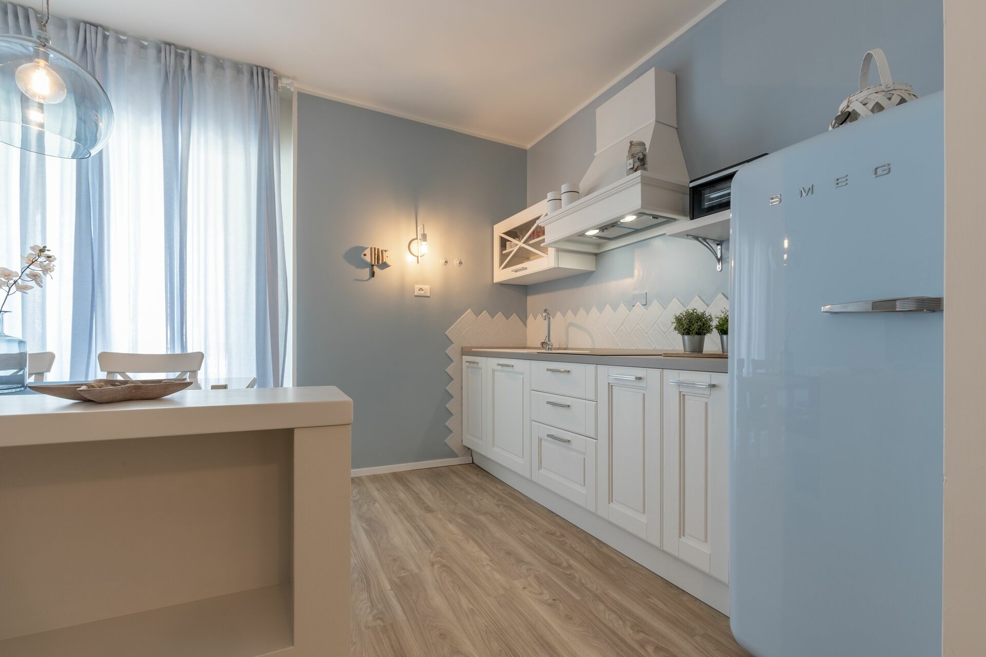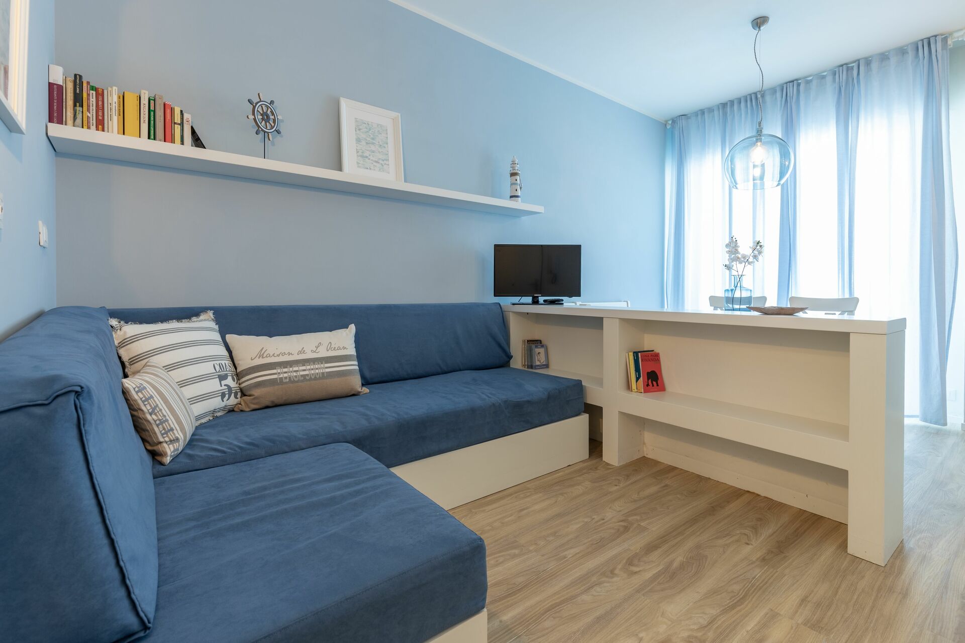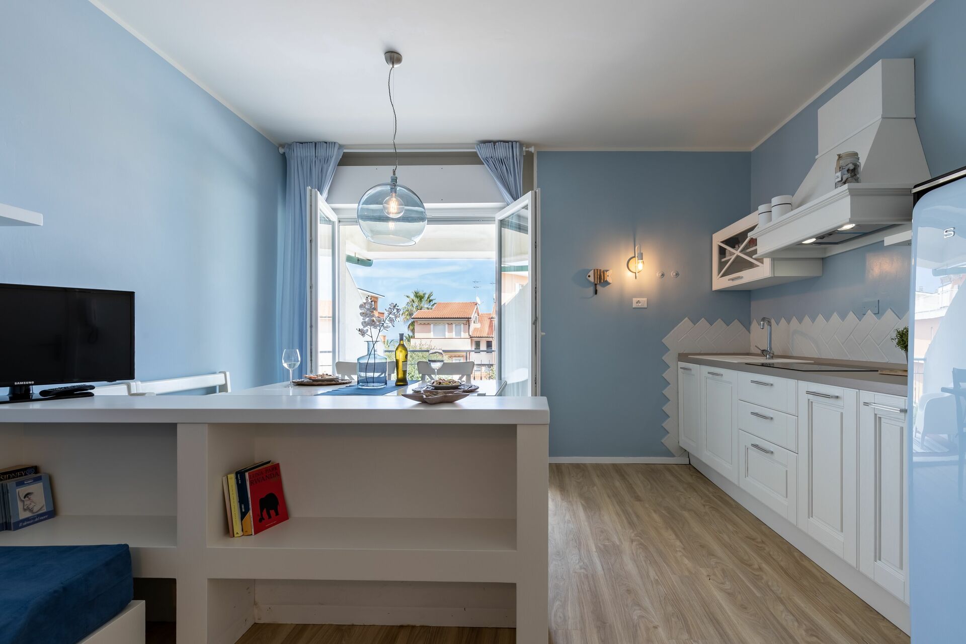 Cucina - soggiorno (30 m2): cucina ben attrezzata, tavolo da pranzo, lavastoviglie, frigo, freezer, microonde, forno, tostapane, macchina da caffè (italiana), macchina da caffè americano, lavatrice, divano, scrivania, internet WIFI, aria condizionata, tv satellitare, uscita sul balcone.