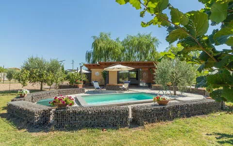 Il giardino privato di 500 m² è arredato con mobili da giardino e dispone di un'area barbecue. La piscina privata misura 5 x 3 metri con profondità di 120 cm ed è mantenuta mediante sistema di pulizia a elettrolisi salina; è disponibile dal 1° giugno al 30 settembre. Gli ospiti hanno accesso condiviso al parco recintato di 3 ettari, adatto a passeggiate e attività all'aperto.