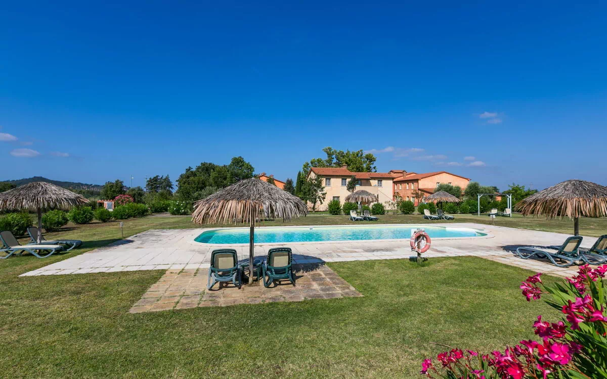 Il parco di 1.500 m² è completamente recintato e offre un'atmosfera tranquilla dove godere della bellezza naturale del paesaggio toscano. Il giardino rappresenta uno spazio accogliente per il relax, con zone d'ombra sotto gli alberi e aree soleggiate. La piscina misura 14 x 6 metri con profondità da 110 a 140 cm ed è disponibile dal 1° giugno al 30 settembre. Una doccia esterna si trova accanto alla piscina; un'area barbecue dedicata è a disposizione per cene all'aperto e riunioni conviviali.