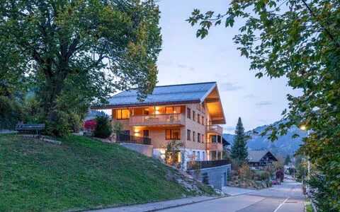 Questa casa vacanze si trova in posizione elevata con viste panoramiche sulla valle di Zweisimmen e sul Rinderberg. Parte di un edificio moderno e sostenibile completato nel 2024, l'appartamento è uno dei 6 alloggi vacanziali della struttura e misura 64 metri quadri con 3,5 stanze. La cucina a pianta aperta è completamente attrezzata con piano cottura in ceramica, forno, frigorifero con congelatore, macchina per il caffè con macinacaffè, frullatore, tostapane e lavastoviglie. Il soggiorno è arredato con divano letto nuovo, 2 poltrone, tavolino, televisione e tavolo da pranzo con 6 sedie. La prima camera da letto dispone di letto matrimoniale 160x200 cm, ampio armadio e cassettiera; la seconda camera ha 2 letti singoli 90x200 cm e ampio armadio. L'appartamento offre 2 bagni: il primo con doccia a filo pavimento, lavabo e WC; il secondo con vasca, lavabo e WC.