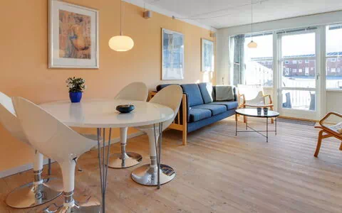 "Amal" - 200m from the sea in Western Jutland", apt. di 2 locali 69 m2. Oggetto adatto a 6 adulti. Soggiorno con TV, CD, impianto stereo e DVD. Cucina (forno, lavastoviglie, 4 piastre cottura in vetroceramica, forno a microonde, congelatore). Doccia/WC. Piano superiore: 1 camera con 1 letto doppio. 1 camera con 1 x 1 letti a castello, 1 letto doppio. Terrazza 10 m2. Barbecue. A disposizione: lavatrice. Parcheggio vicino alla casa. Prego notare: appartamento per non fumatori. Massimo 1 animale/cane consentito.
