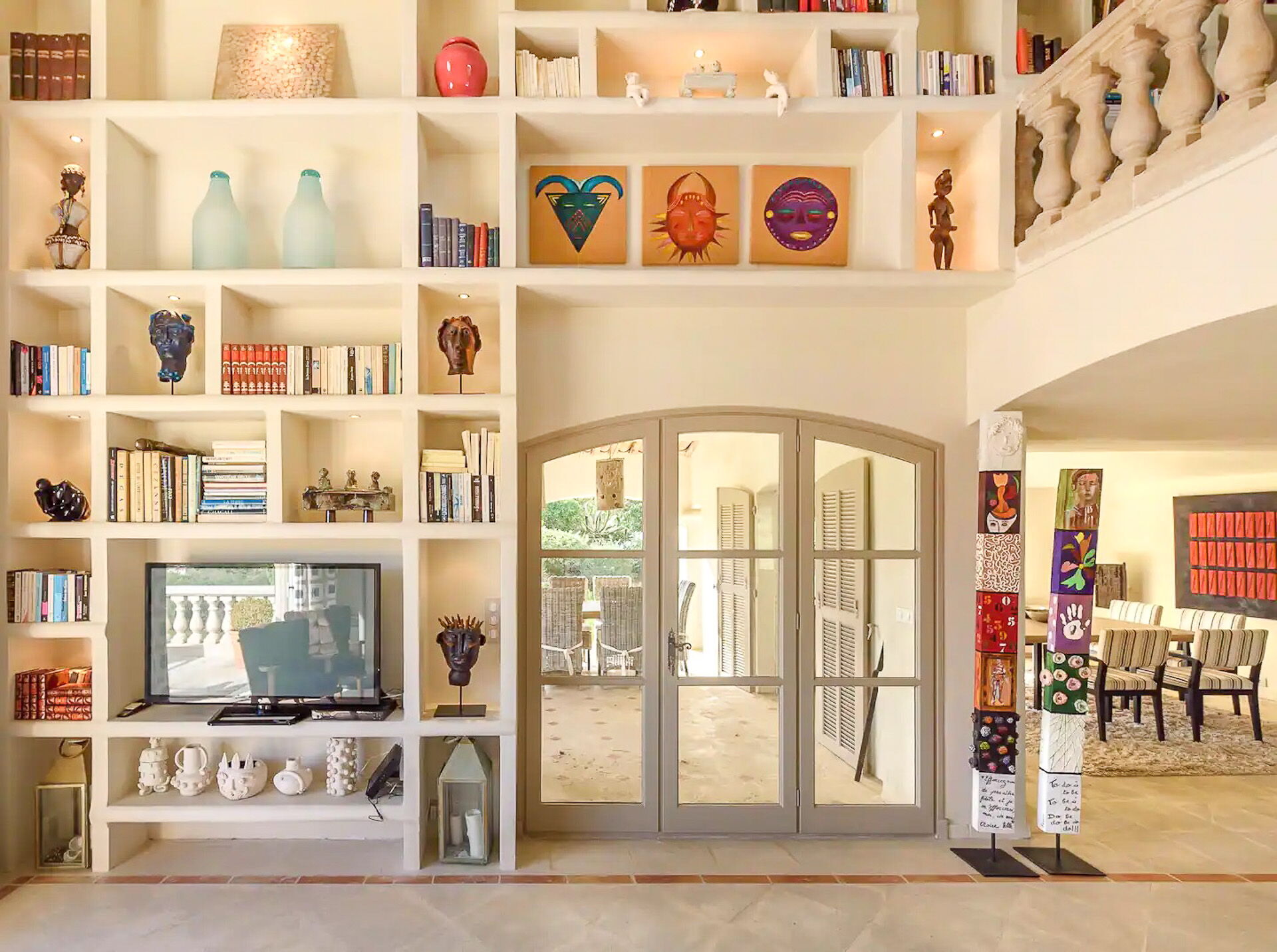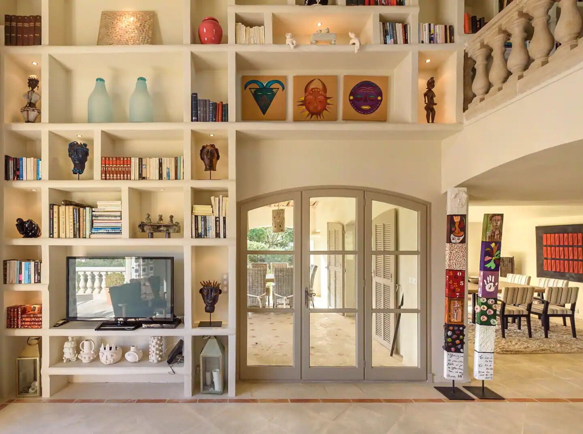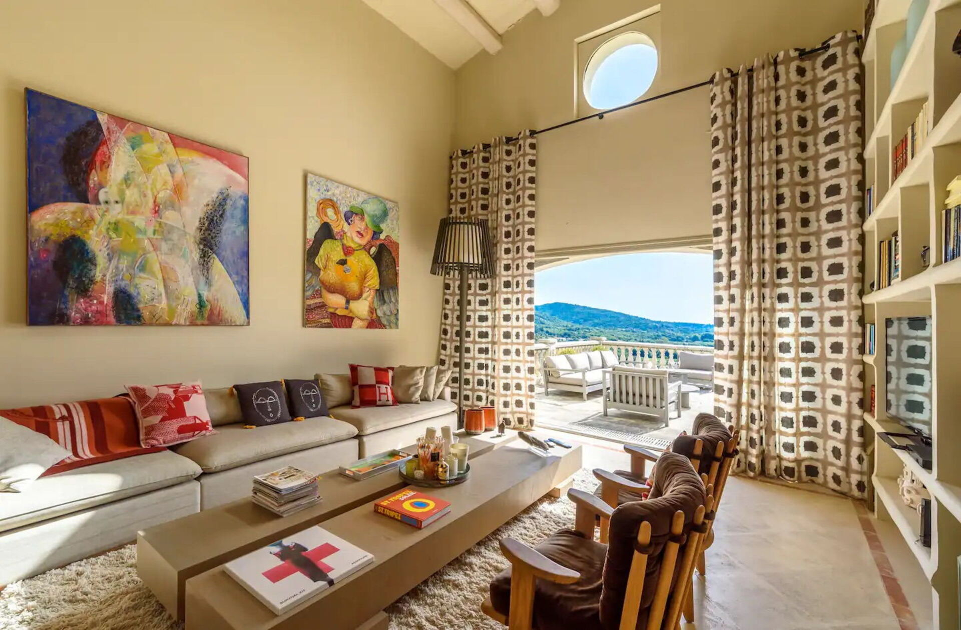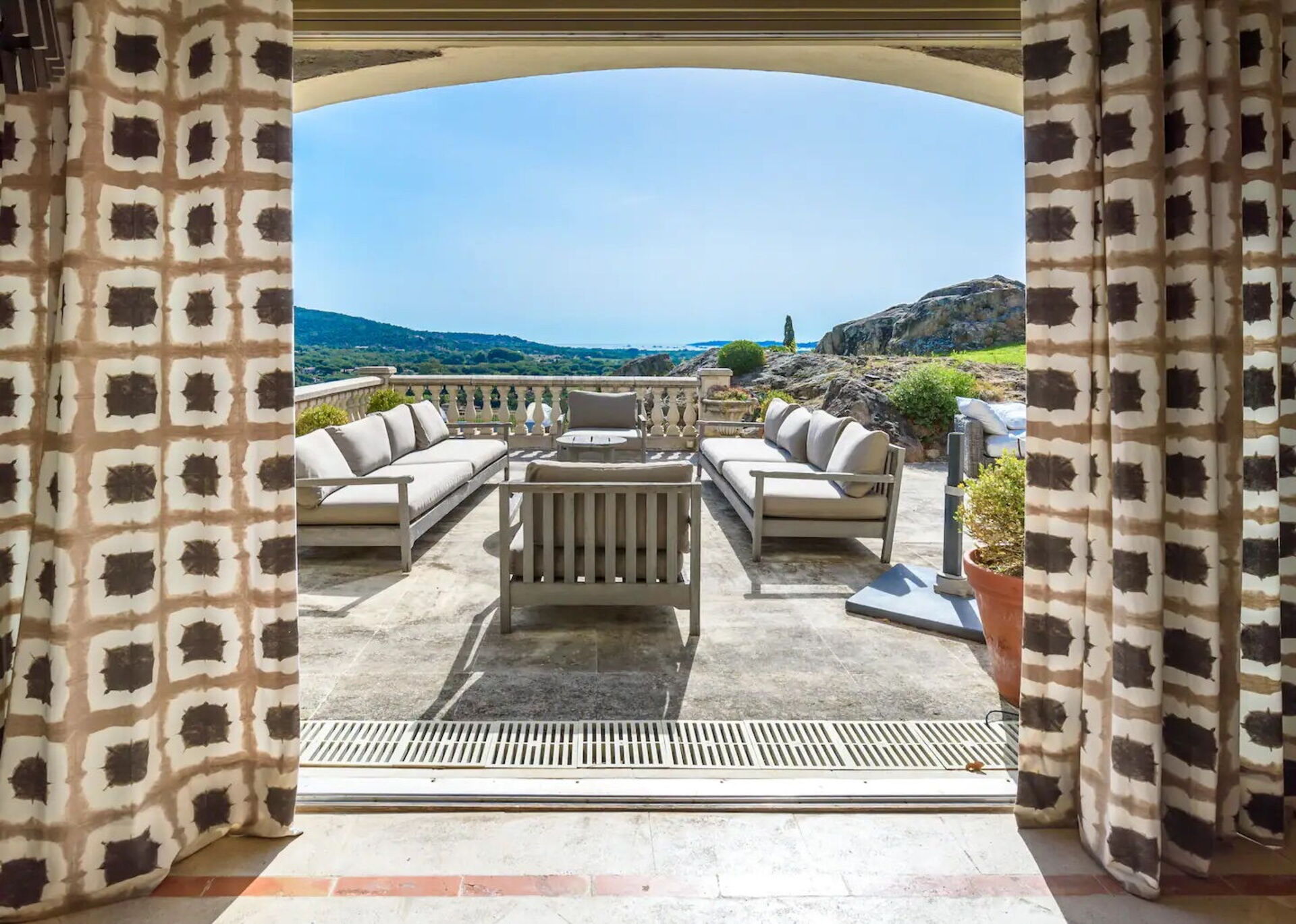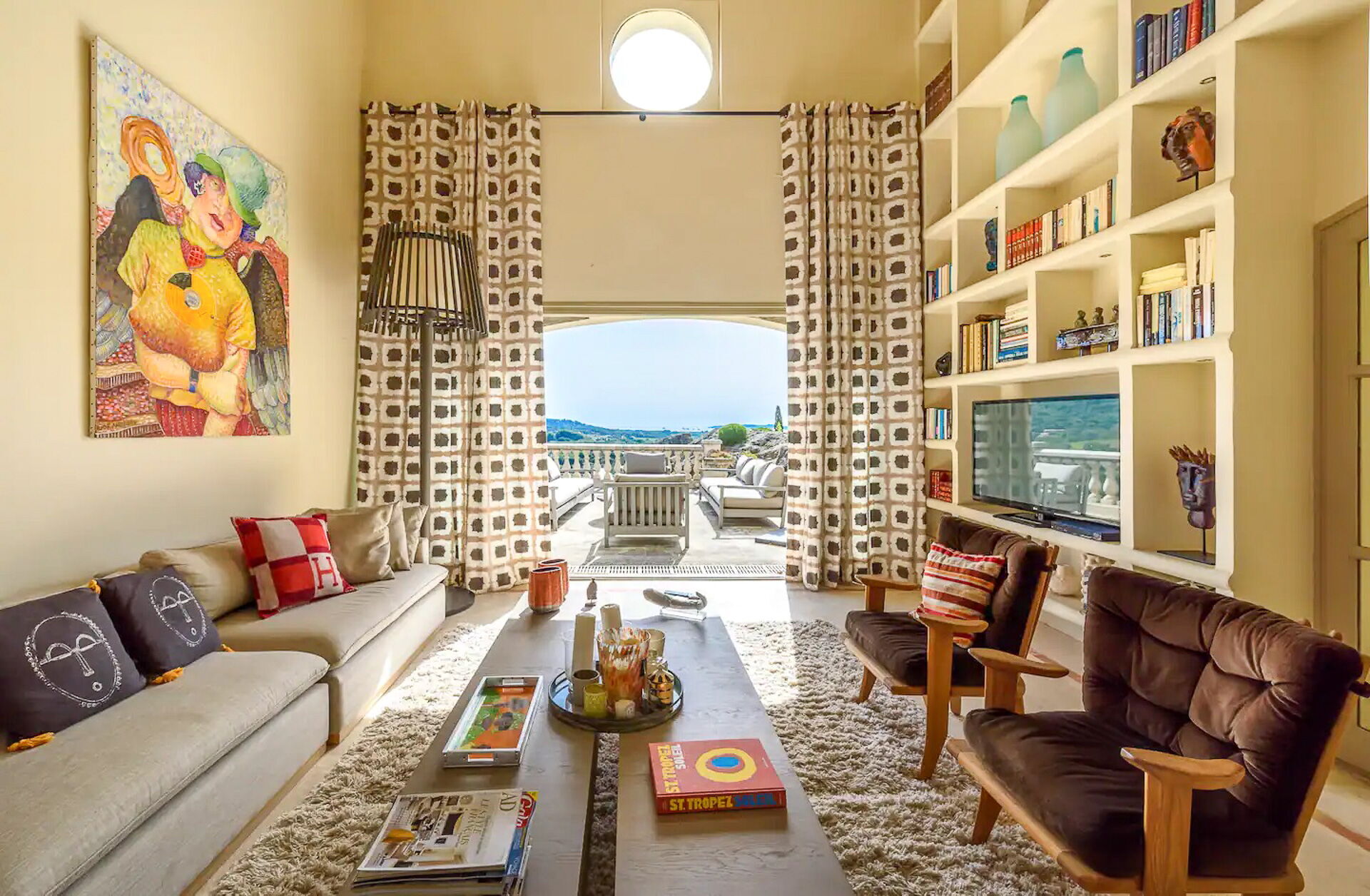 La tonalità beige è parte integrante della zona living ,finemente arredata con poltrone e un ampio divano, che dà accesso a una meravigliosa terrazza ,arredata con comodi divani da giardino, che dà modo agli ospiti di godere del meraviglioso panorama sul mare della costa azzurra che solo la posizione di questa villa può regalare.