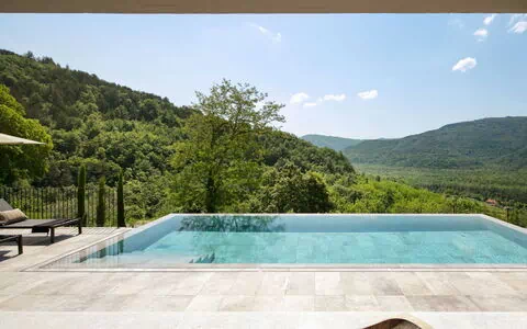Villa "Panorama del Tartufo" è una casa vacanze di tre piani, splendidamente ristrutturata, situata nella frazione di Žugani, a 8 km dal centro di Motovun, Buzet, Croazia. Questa proprietà offre una posizione tranquilla e soleggiata su un pendio, immersa nella campagna, eppure solo a 30 km dal mare. Vanta un giardino privato con prato, una piscina angolare (10 x 4 m, profondità 140 cm, disponibile stagionalmente dal 1° maggio al 30 settembre) con scala interna, doccia/WC nell'area piscina, doccia esterna, terrazza (50 m2), mobili da giardino e barbecue. La villa è ben attrezzata con comodità come Internet WiFi, sauna, sala relax, sala giochi con calciobalilla, trampolino, riscaldamento centrale, aria condizionata e lavatrice. È disponibile un parcheggio fino a 3 auto nella proprietà.