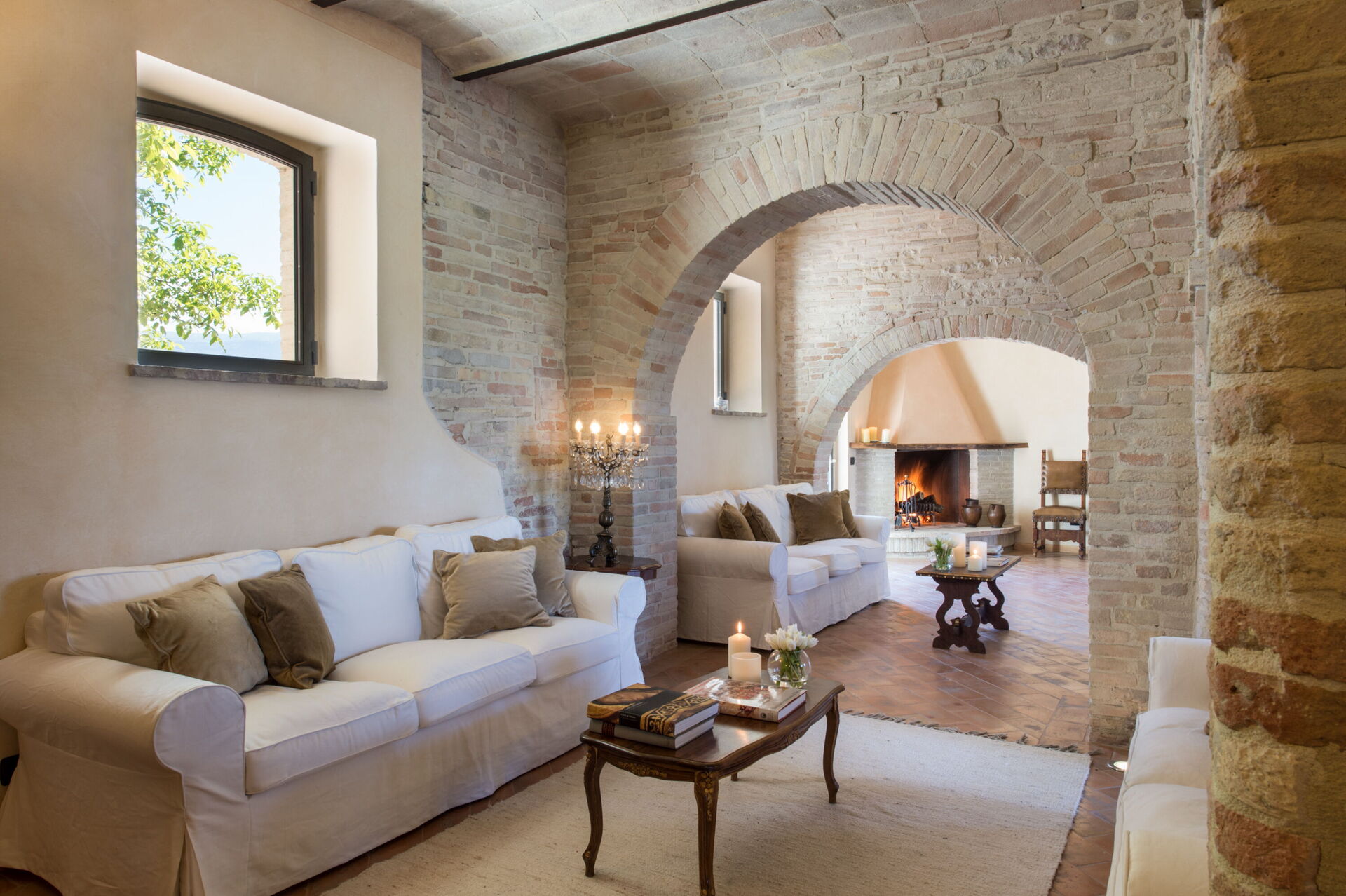 Soggiorno (40 m2): divano, tre poltrone, caminetto, tavolo da pranzo, internet WIFI, aria condizionata, uscita sulla terrazza.
