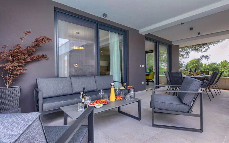 La villa "Nika" è una casa vacanze moderna di due piani situata in una posizione soleggiata e rialzata a Medulin, Croazia. Vanta un giardino privato con prato, alberi e una piscina riscaldata angolare (13 x 4 m, profondità 140 cm, disponibile stagionalmente dal 1° aprile al 1° novembre) dotata di una scaletta interna e un sistema di pulizia della piscina a elettrolisi salina. La proprietà offre servizi come doccia esterna, terrazza, mobili da giardino, barbecue, accesso a internet, sauna, massaggio (extra), idromassaggio, area spa, aria condizionata, lavatrice e parcheggio coperto per tre auto.