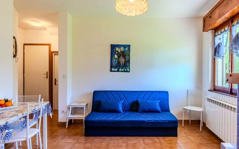 L'appartamento ha un arredamento semplice e pratico, rendendolo adatto per un soggiorno di vacanza. Offre una vista sulla campagna, fornendo un ambiente sereno e tranquillo. Si prega di notare che la capacità massima è di due persone, poiché c'è una camera da letto matrimoniale e un divano letto matrimoniale nel soggiorno/sala da pranzo. La proprietà consente un massimo di un animale domestico.