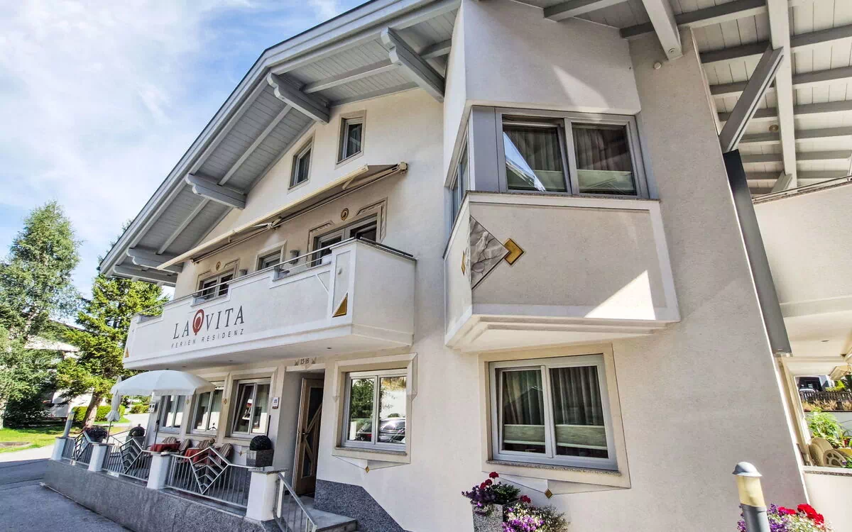 La "LaVita" offre un appartamento di 3 stanze che si estende su 54 metri quadrati al 1° piano. Dispone di un ingresso, 2 camere da letto matrimoniali, ciascuna dotata di doccia/WC e TV satellitare (schermo piatto), oltre all'accesso a un balcone. L'accogliente zona giorno include una piccola cucina con lavastoviglie, 4 piastre a induzione in ceramica, tostapane, bollitore, microonde e macchina elettrica per il caffè, oltre a un tavolo da pranzo. L'appartamento è dotato di pavimenti in parquet in tutta la casa e ha 2 piccoli balconi con mobili da balcone, offrendo una vista laterale sulle montagne.