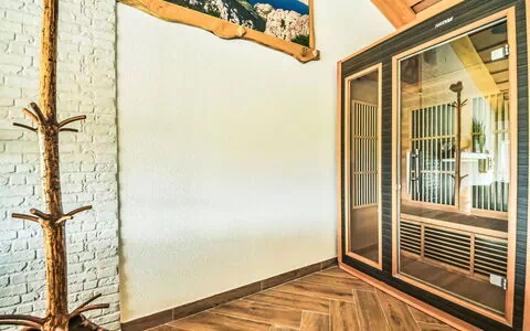 La proprietà è una casa di 3 stanze con 120 metri quadrati di spazio su due livelli. Al piano principale, c'è una stanza con un letto francese da 180 cm di larghezza e 200 cm di lunghezza, una cucina a vista attrezzata con forno, quattro piastre a induzione in ceramica, congelatore e macchina elettrica per il caffè. La cucina dispone anche di aria condizionata e un'uscita che conduce alla terrazza. C'è anche un bagno con vasca, bidet e toilette a questo livello. È disponibile il riscaldamento a legna. Il piano superiore, accessibile tramite una scala a chiocciola, presenta soffitti inclinati e una stanza con un letto francese da 160 cm di larghezza e 200 cm di lunghezza.
