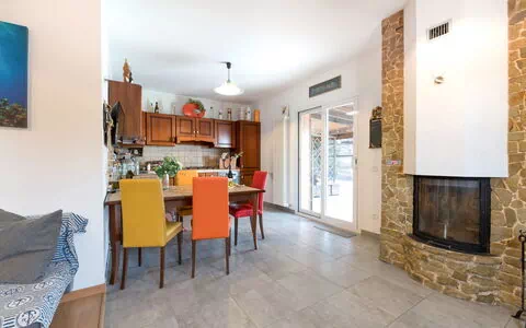 Cucina - soggiorno: cucina ben attrezzata, tavolo da pranzo, frigo, freezer, piano cottura, forno, macchina da caffè (italiana), divano, caminetto, internet WIFI, tv satellitare, televisione, uscita sul giardino.