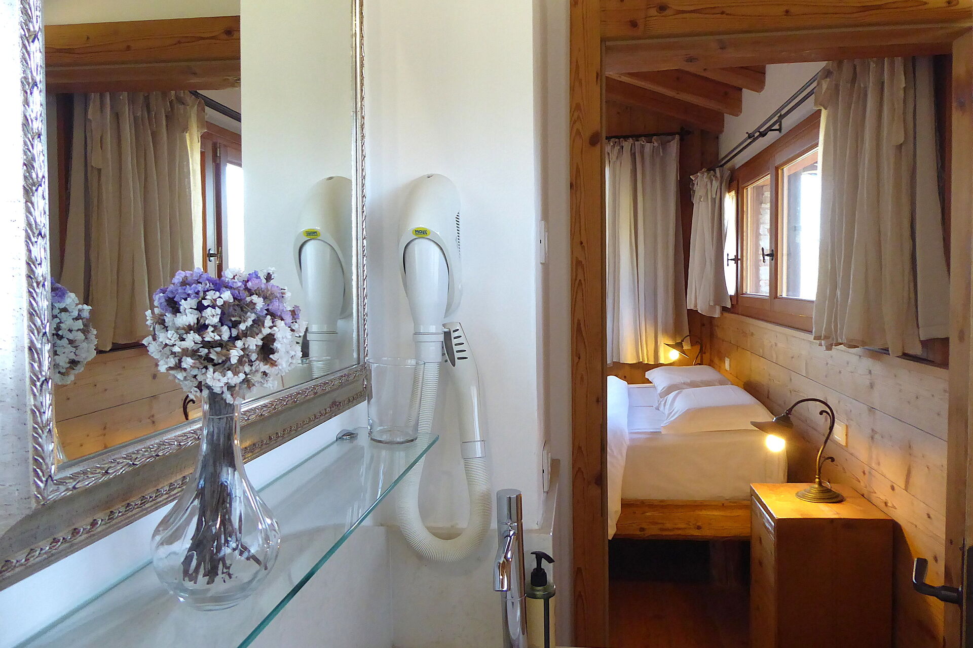 Camera da letto con bagno 1: letto matrimoniale, letto singolo, internet WIFI, aria condizionata, televisione, lavandino, wc, bidet, doccia, asciugacapelli.