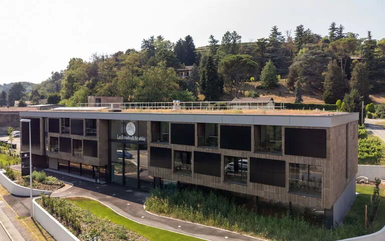 Lo Scudo di Stabio è un moderno e confortevole aparthotel situato a Stabio, Svizzera, posizionato a 20 km da Lugano Centro a 350 metri sul livello del mare. Questa proprietà indipendente a due piani è stata costruita nel 2022 e si trova circondata da prati e vigneti in una posizione esposta a nord-est. La residenza comprende 15 appartamenti ed è situata nella zona turistica, a 1 km dal centro di Stabio su una strada principale. La proprietà dispone di reception, un salone con TV, Internet WiFi in tutta la struttura, un ascensore, un deposito per biciclette, impianto di riscaldamento centralizzato e aria condizionata. L'accesso motorizzato alla casa è disponibile, con parcheggio fornito all'interno della proprietà e una stazione di ricarica per veicoli elettrici per la vostra comodità. La proprietà si trova su 1.000 m2 di terreno condiviso con un ampio e bellissimo giardino con prato e piante, offrendo un attraente spazio cortile per gli ospiti. Questa innovativa struttura per vacanze combina ospitalità flessibile con sostenibilità continua, offrendo 22 appartamenti arredati che vanno da 35 a 50 m², completati da aree comuni tra cui una sala comune di 130 m² e una sala riunioni di 26 m². L'approccio è olisticamente sostenibile, con strutture portanti realizzate principalmente in legno con telaio prefabbricato, materiali isolanti naturali, un tetto verde e sistemi altamente efficienti per ridurre il consumo energetico e le emissioni durante l'intero ciclo di vita. Le facciate in sughero a vista integrano moduli fotovoltaici sui lati sud e ovest, combinando la produzione di energia con l'identità architettonica. Il complesso è il primo edificio in Ticino ad essere certificato SNBS e ha ottenuto la certificazione Minergie-P-ECO (n. TI-011-P-ECO) e il marchio Swisstainable - Livello II, dimostrando la sua qualità ecologica, sociale ed economica. È stato anche selezionato e riconosciuto agli Active House Awards 2022, evidenziando la sua attenzione al comfort degli utenti, inclusi luce, aria e benessere insieme all'efficienza energetica.