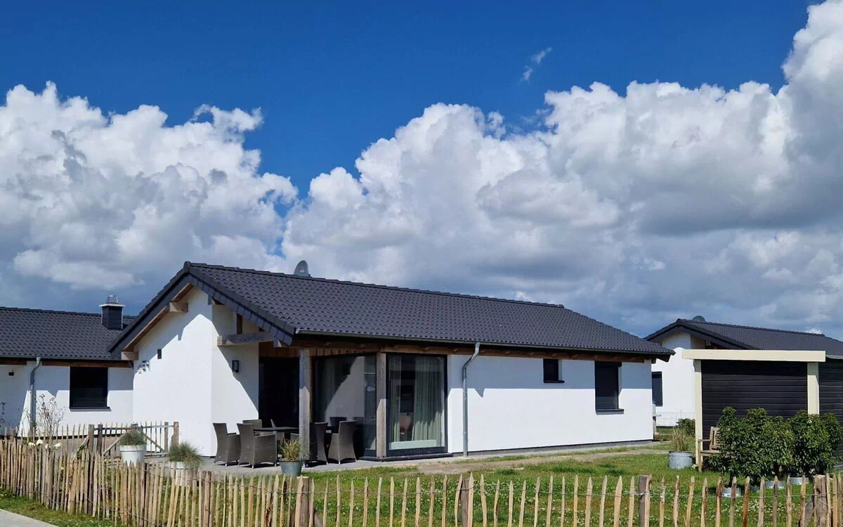 Newly built house G 24, SAUNA with outdoor shower (ATTENTION SAUNA in the outdoor area in your own garden), fenced, first occupancy 2022, no pets allowed, electric shutters in the 2 bedrooms, 1 bathroom + 1 guest toilet, fly screens on all windows, fully tiled, washing machineNewly built holiday home with 66 sqm living space for 5 people with 2 bedrooms, 2 double beds and 1 bathroom + 1 guest toilet- Own 429 sqm plot- 2 bedrooms (1x double bed, 1 double bed + 1 bunk bed)1 bathroom with wall-mounted towel radiator- 1 spacious living room with large floor-to-ceiling windows- Fully equipped fitted kitchen with dishwasher and microwave- 1 storage room / 1 hallway- Covered sun terrace with garden furniture, parasol, garden loungers, barbecue- Outside water tap- 2 car parking spaces.No pets allowed, not suitable for people allergic to pets!Electricity, gas, final cleaning and water consumption includedVisitor's tax/guest card according to valid statutesExempt are: Severely disabled persons (and 1 accompanying person) with 80% degree of disability as well as the 3rd and each additional child of a family, provided that the guest contribution is paid for the 1st and 2nd child.SAUNA (ATTENTION SAUNA in the outdoor area in our own garden)The house is located in the holiday village Eckwarderhörne in the immediate vicinity of the dyke, the ferry dock (including passenger / bicycle ferry to Wilhelmshaven) and a 50,000 square metre inland lake belonging to the holiday village (with an approx. 500 square metre sandy lawn directly on the inland lake, swimming pontoon and jetties).The Eckwarderhörne lido with its beach hall, lighthouse, ferry landing stage and starting point for guided mudflat walks is about 800 m away. In the idyllic holiday village, away from the traffic, there is the "To'n Spieker" dyke inn, bicycle hire, children's playground and a 1,000 m² play area with beach volleyball court, badminton court, basketball hoop, outdoor table tennis table, sandpit and swings.