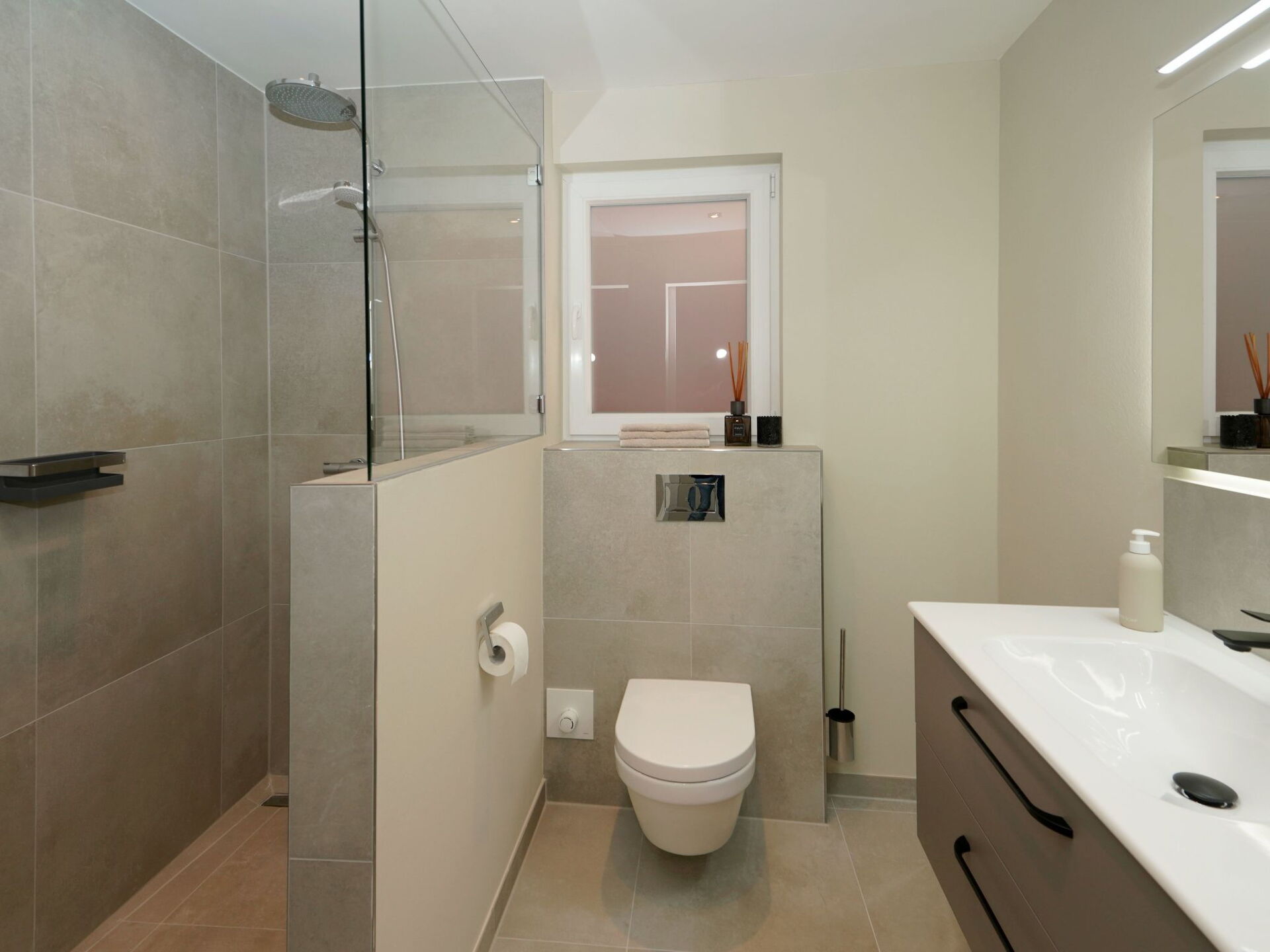 Il bagno con cabina doccia aperta è dotato di doccia a pioggia integrata, servizi igienici, bellissimi impianti di lavaggio e naturalmente asciugacapelli e asciugamani.