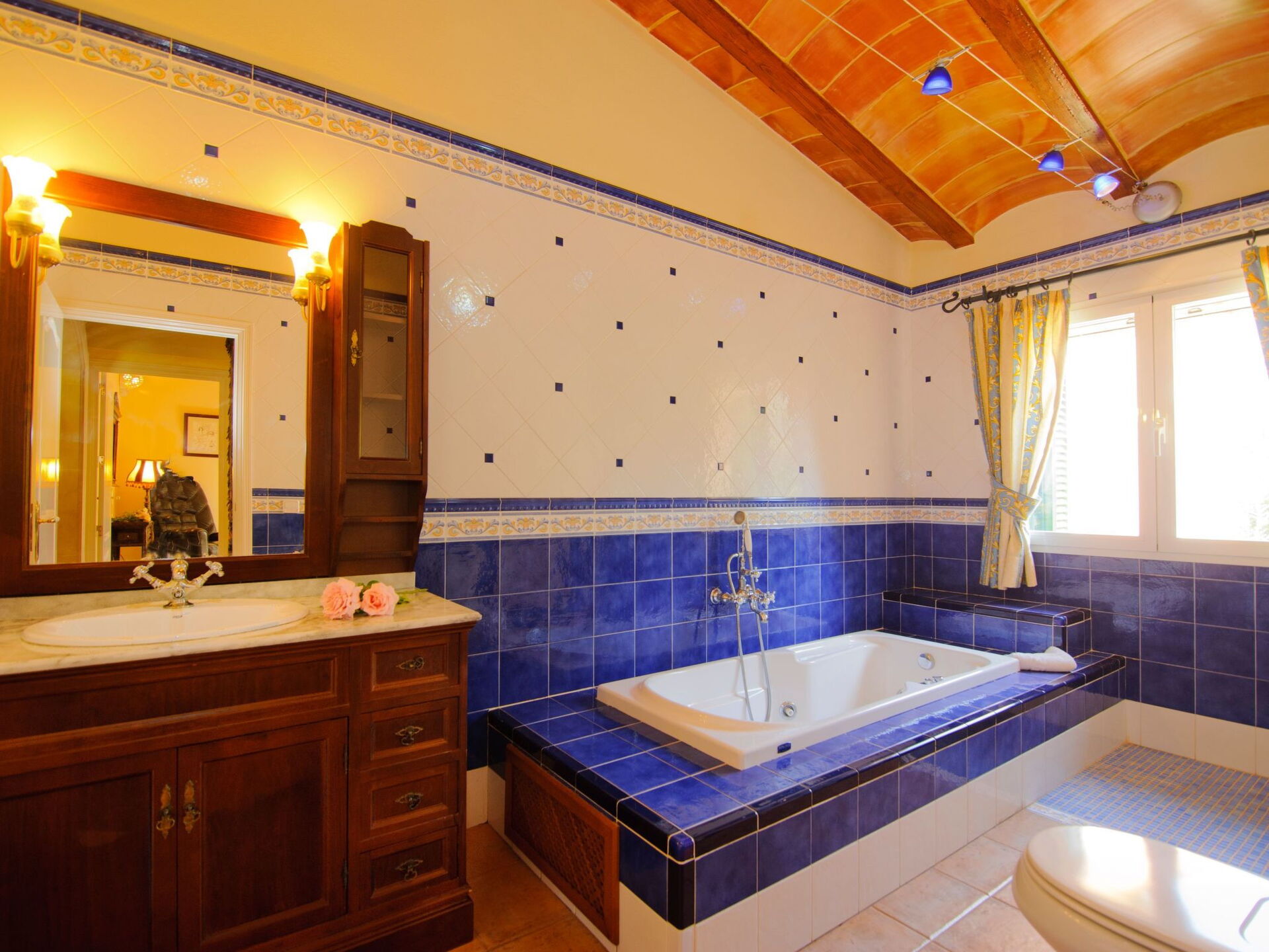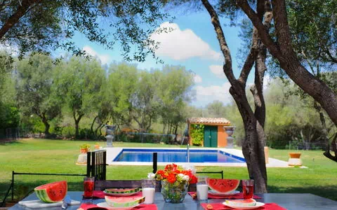 The natural stone holiday home "Gallicant" is located in the south of Mallorca, between the villages of Campos and Santanyí. It is surrounded by a very large plot of land (20 ha) and 1 km from the road, which promises peace and quiet. The beautiful sandy beach of Es Trenc and the beautiful beaches of the Cala Mondragó nature park can be reached by car in just 15 minutes. The capital Palma is only 30 minutes away. Santanyi, with its charming weekly market (Saturdays), is just 10 minutes away and Cala D'Or, the well-known tourist resort, can be reached in 15 minutes.The farmhouse "Gallicant" is an enchanting country house in the centre of the Mallorcan "Fora Vila". The terrace with pergola leads into the large living/dining room. Here there is a double sofa bed, satellite TV and DVD player are also available. The American-style kitchen, fully equipped, leads to the barbecue area. The house has three bedrooms, two of which have en-suite bathrooms. A separate, complete bathroom is also available.Olive trees, pine trees and Mediterranean garriga bushes fill the plot. A large terrace with barbecue, as well as the pool, surrounded by large green areas, are ideal for relaxing. Of course, there are also sun loungers.The house can be heated with central heating on request, for a daily heating fee. Please enquire if you are interested. ESFCTU00000700800012605100000000000000000000ETV/2