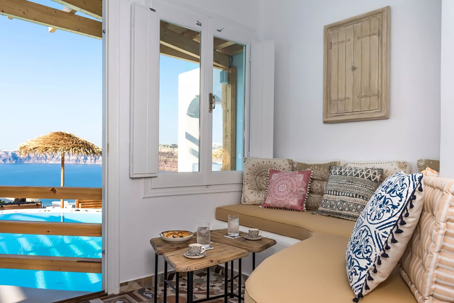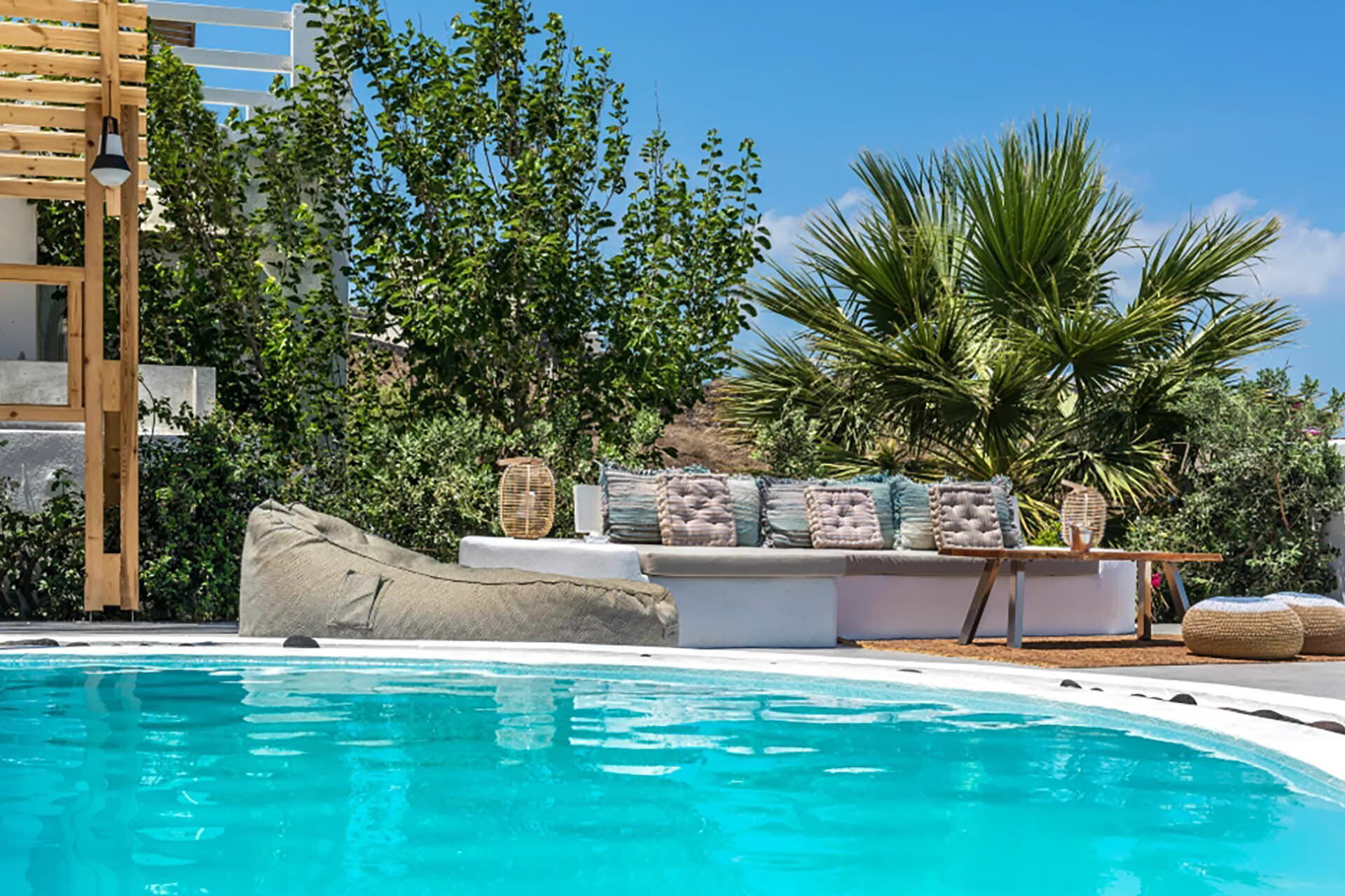 Gli spazi esterni di Villa Sean sono stati concepiti per valorizzare i panorami naturali circostanti. Una piscina privata rappresenta l'elemento centrale, accompagnata da lettini prendisole, mobili da terrazza e un'area dedicata ai pasti all'aperto con tavolo da pranzo, il tutto con viste sulla caldera e il mare. Una vasca idromassaggio esterna offre uno spazio aggiuntivo per il relax, mentre un piccolo bar consente agli ospiti di trascorrere momenti di svago. È disponibile anche una piattaforma esterna dedicata, adatta ad attività come yoga o Pilates.