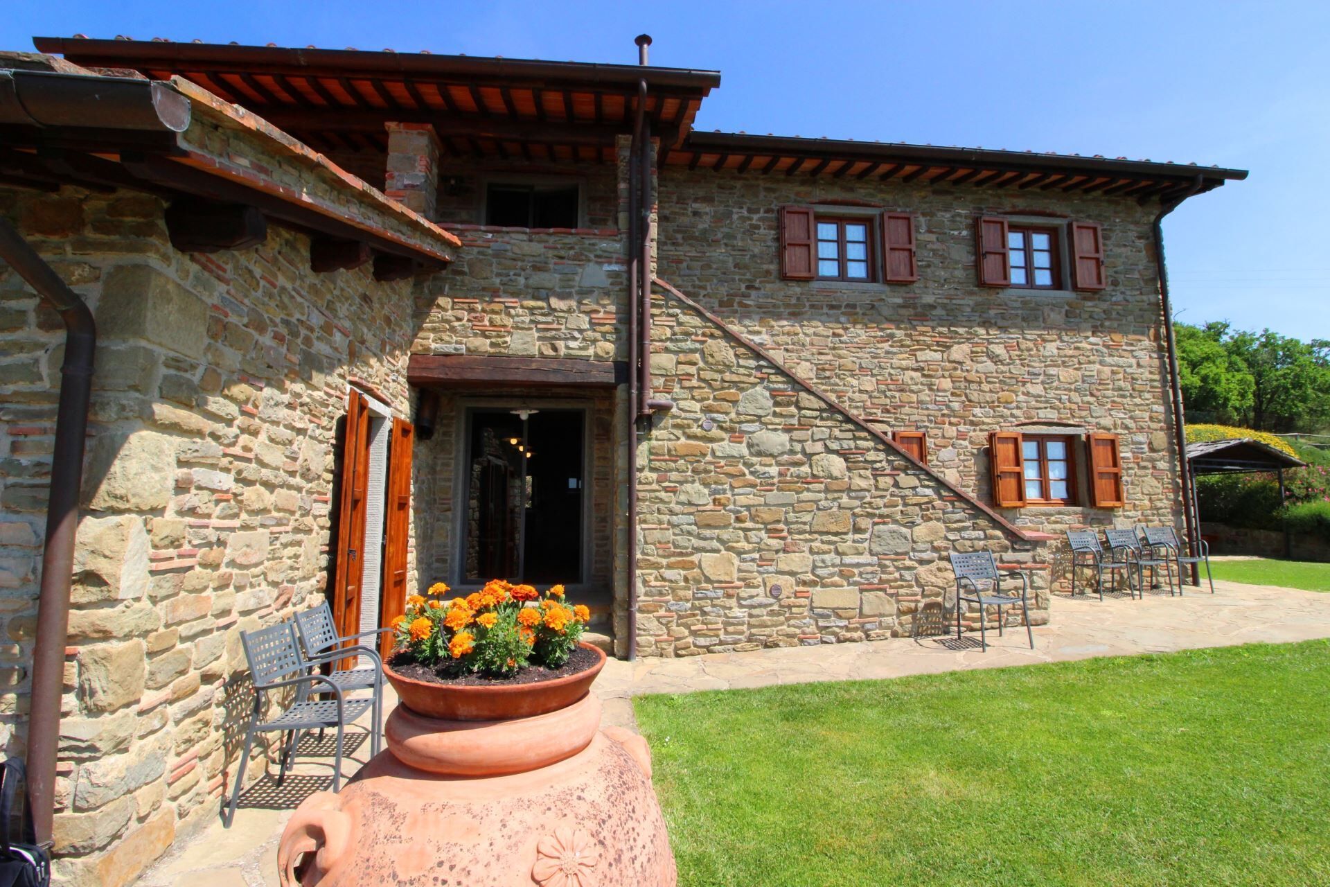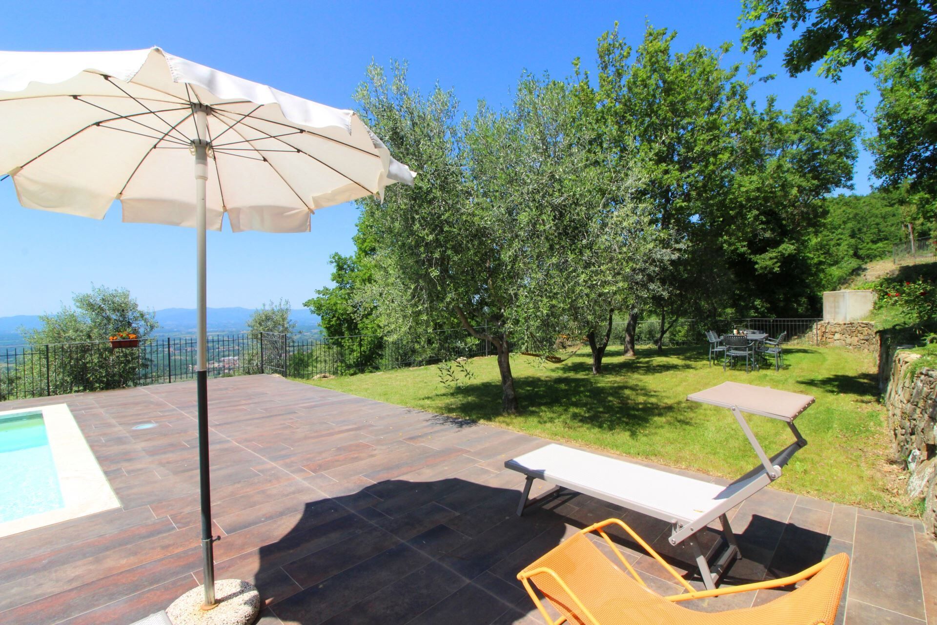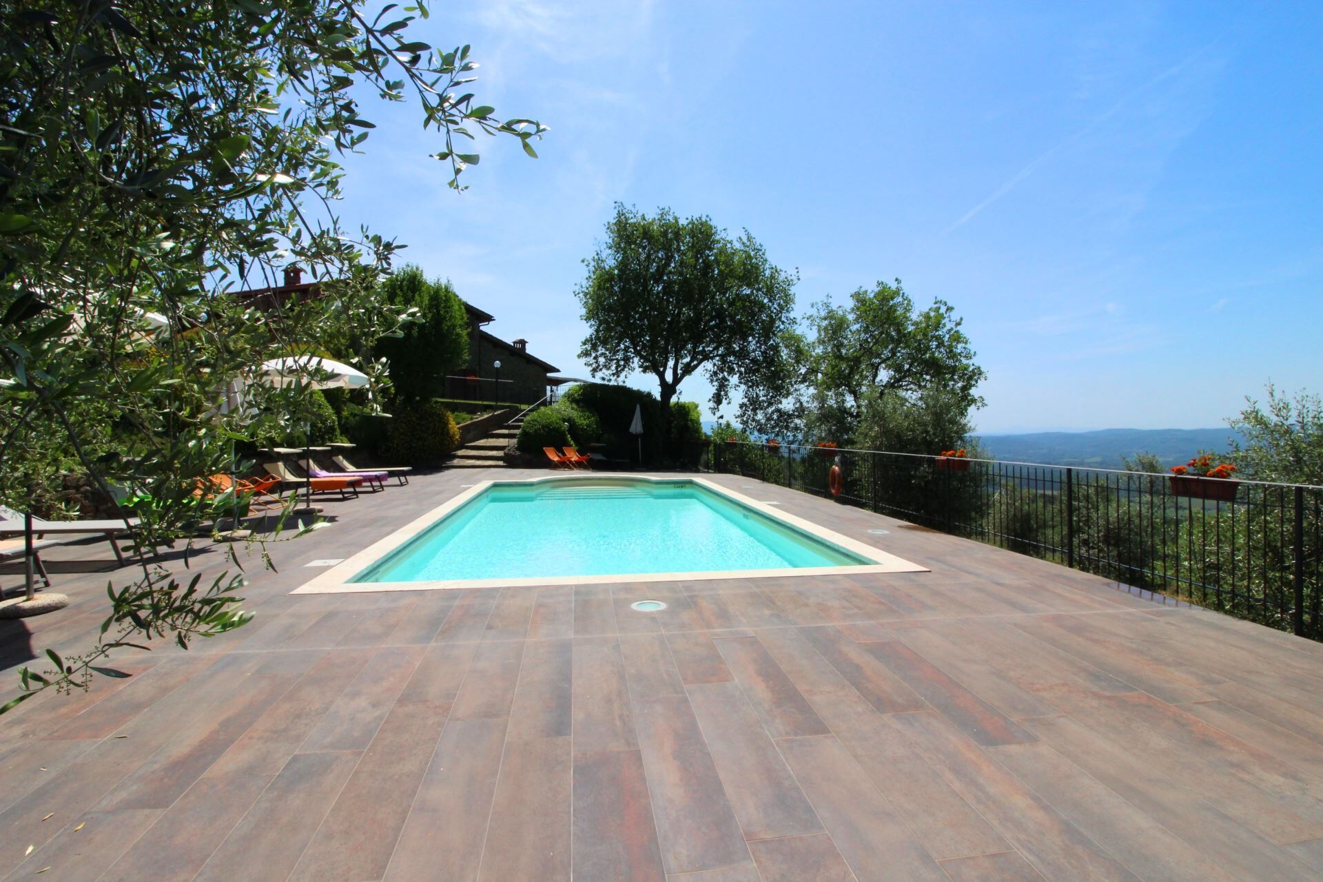 Tutto intorno alla casa un ampio giardino dove ogni appartamento dispone di uno spazio privato con gazebo arredato con tavolo e panche per mangiare all'aperto, mentre di fianco alla casa si trova la bella piscina panoramica completamente recintata (dimensioni 5x10 m - profondità 1,20 m.) dotata di solarium, lettini prendisole e ombrelloni e realizzata su una terrazza naturale che offre un panorama unico sulla valle dell'Arno e sul paese di San Giustino Valdarno. Il barbecue ed il forno a legna saranno il punto di riferimento per le vostre serate a base di carne alla griglia e pizza da gustare in allegra compagnia. In una terrazza sul retro delle casa si trovano uno scivolo ed un’altalena per il divertimento dei più piccoli. All’interno della proprietà si trova la piccola cantina dove potrete degustare ed acquistare dell’ottimo vino e olio extravergine di oliva biologici.