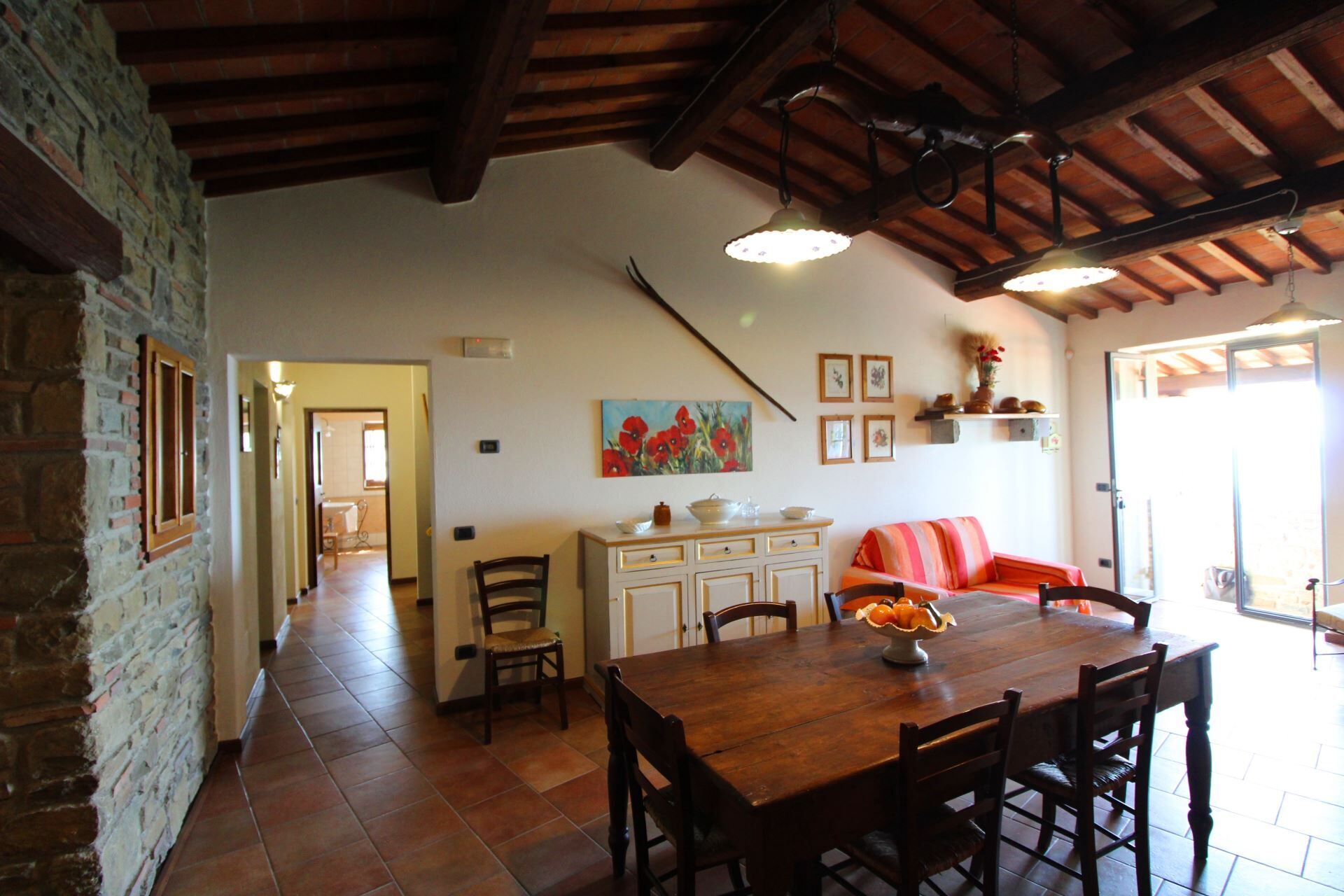 Appartamento al piano primo con ingresso da scala esterna in pietra e tipica loggetta. Ampio soggiorno-pranzo con camino e divano, cucina, due camere matrimoniali, camera con tre letti singoli, due bagni con doccia.