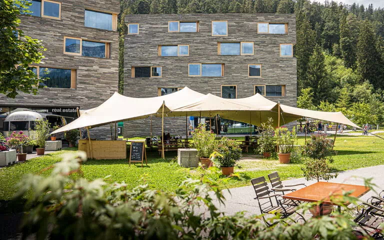 L'ambiente esterno del "rocksresort" rispecchia il paesaggio alpino straordinario che circonda Laax. Le aree comuni sono accessibili in auto e la posizione centrale e soleggiata del complesso garantisce spazi esterni illuminati naturalmente durante tutto il giorno. La zona sciistica si trova a soli 50 metri dalla proprietà, permettendo l'accesso diretto alle piste con gli sci quando le condizioni di neve sono favorevoli. I sentieri per mountain bike e i percorsi escursionistici iniziano praticamente alle porte del resort; la Baumwipfelpfad, la passerella tra le chiome degli alberi, è accessibile a 50 metri di distanza. Un'area giochi per bambini si trova a 50 metri dal resort. Lo scenario naturale è incorniciato dalla drammatica scenografia delle montagne svizzere.