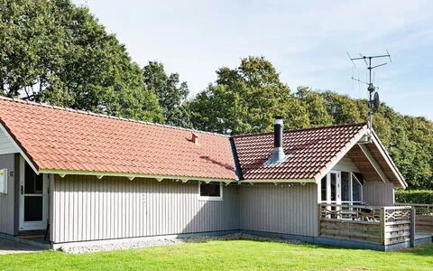 Child-friendly holiday cottage located on a natural plot approx. 300 m from a good beach at Kvie Sø. In the spacious living room there is a wood-burning stove and good furniture, PlayStation2 with fun games and DVD films. The bedrooms have box mattresses. The large bathroom has whirlpool snd sauna. 2 terraces with good garden furniture, grill and playground. There is a trampoline (usage at own risk/insurance). Approx. 500 m to lake suited for swimming and approx. 1 km to lake suited for fishing. There is a
