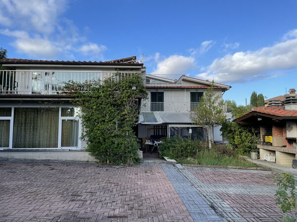 Il primo piano, raggiungibile tramite scala interna, ospita un ampio soggiorno che si apre su una terrazza con vista panoramica sulla campagna circostante. Questo livello comprende 4 camere da letto aggiuntive, ciascuna con accesso diretto a una terrazza privata: la prima è una camera doppia con doccia, bidet e WC privati; la seconda accoglie 3 letti; la terza è una camera doppia con doccia, bidet e WC; la quarta dispone di doccia, bidet e WC. Sul primo piano è inoltre disponibile una doccia, un bidet e un WC in comune.