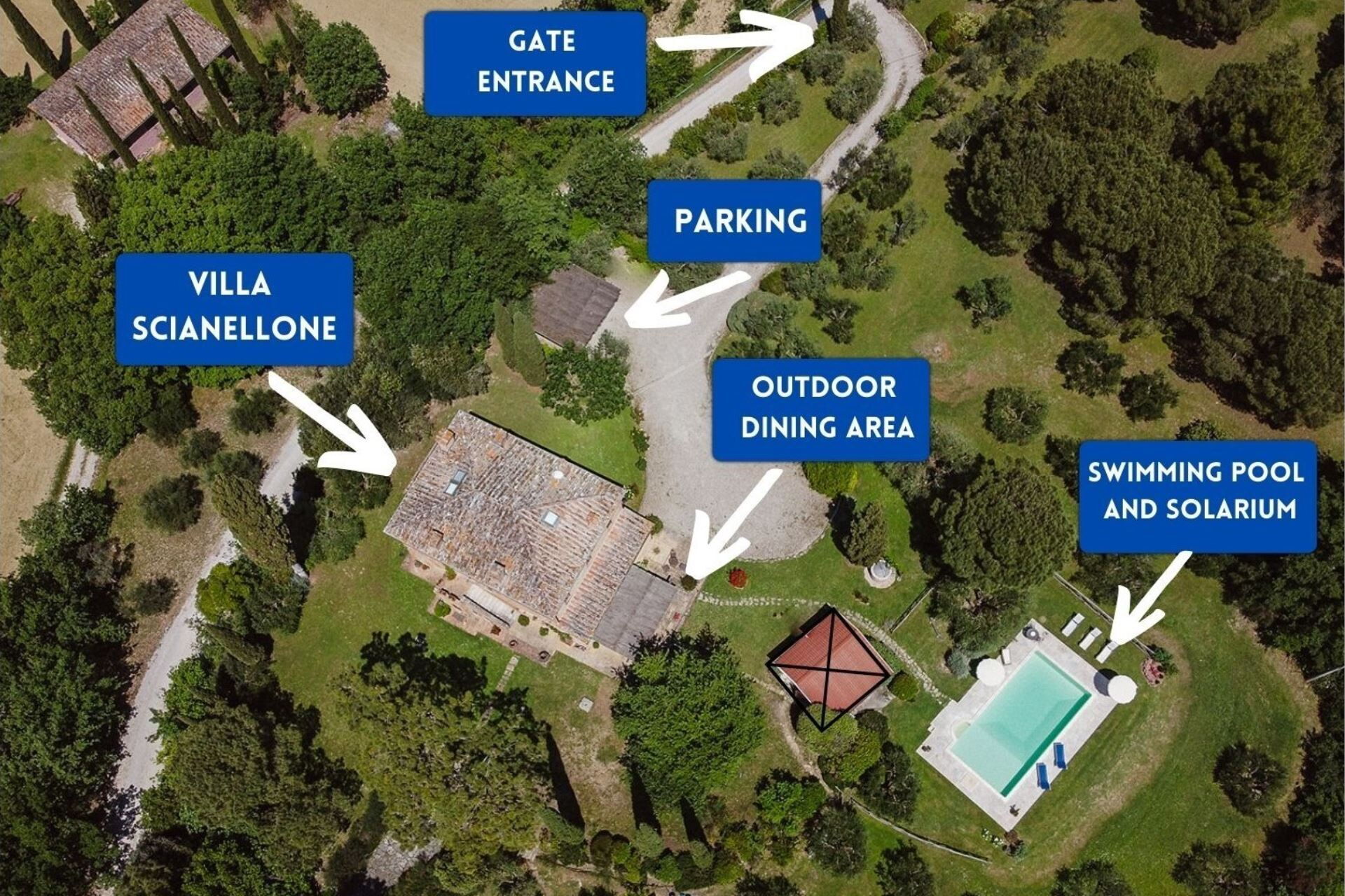 Villa Scianellone è circondata da rigogliosi e argentati olivi, vigne e prati che fanno parte della proprietà. Tutto intono alla villa avrete a disposizione un ampio e curato giardino (circa 5.000 m2), dove si trovano una fresca pineta attrezzata con giochi per i vostri bambini e la bella piscina (dimensioni 5x10 m. – profondità 1,20 - 1,80 m. - aperta dal 01 Maggio al 30 Settembre).