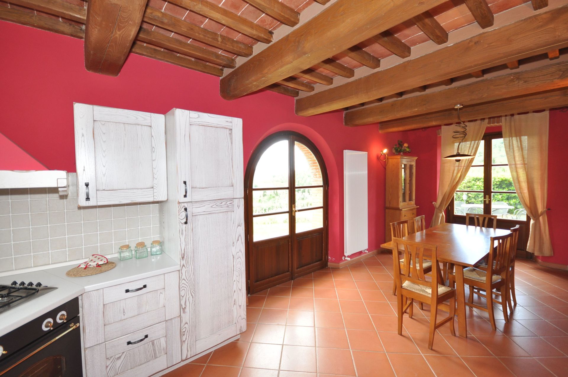 Piano terreno: ingresso su ampio soggiorno (TV satellitare) con camino, zona pranzo con cucina (forno, freezer, lavastoviglie) e accesso sull’esterno.